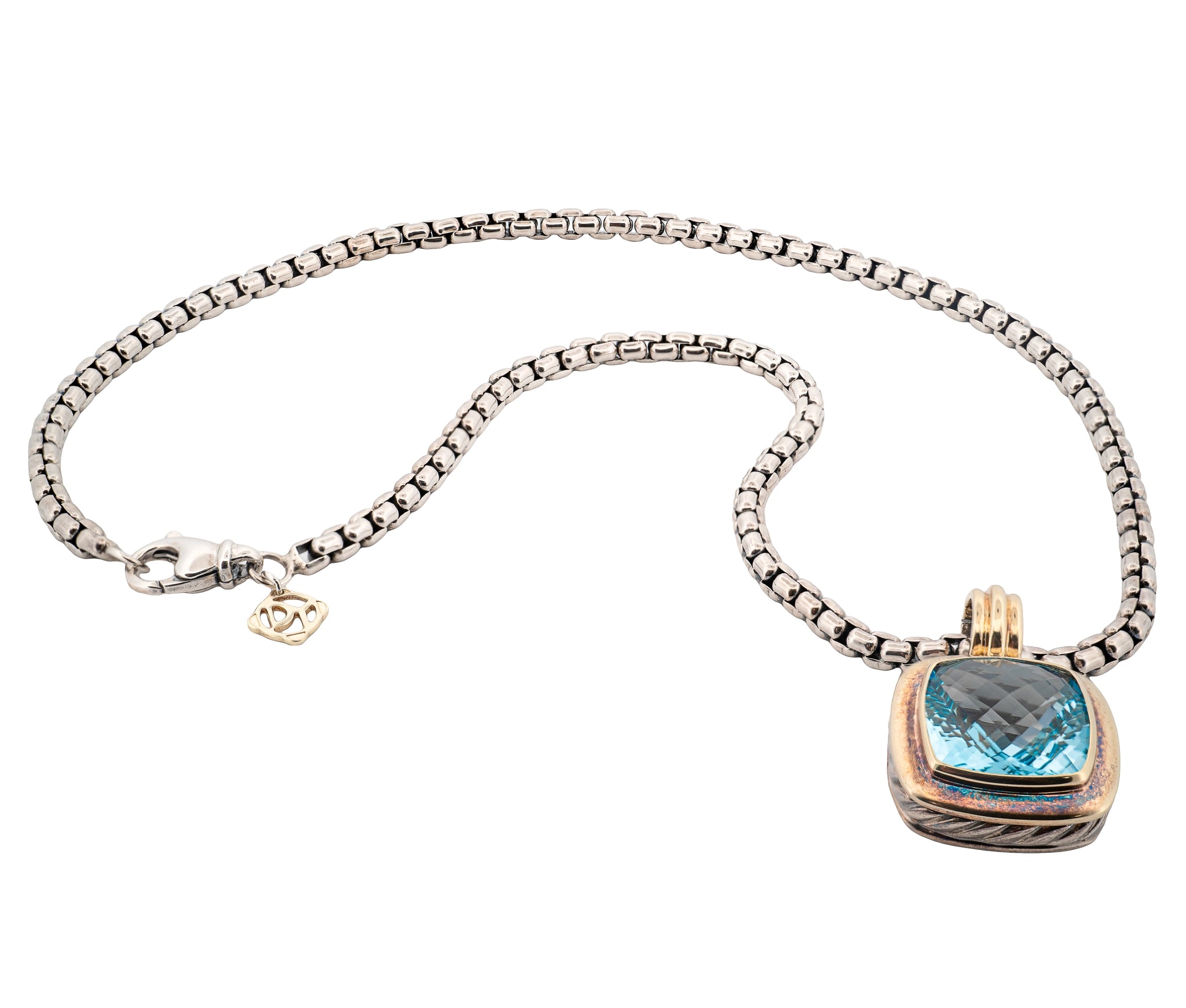 Elegant and timeless, this David Yurman necklace features a radiant blue topaz set in sterling silver with 18K yellow gold accents, showcasing the brand’s iconic cable design.