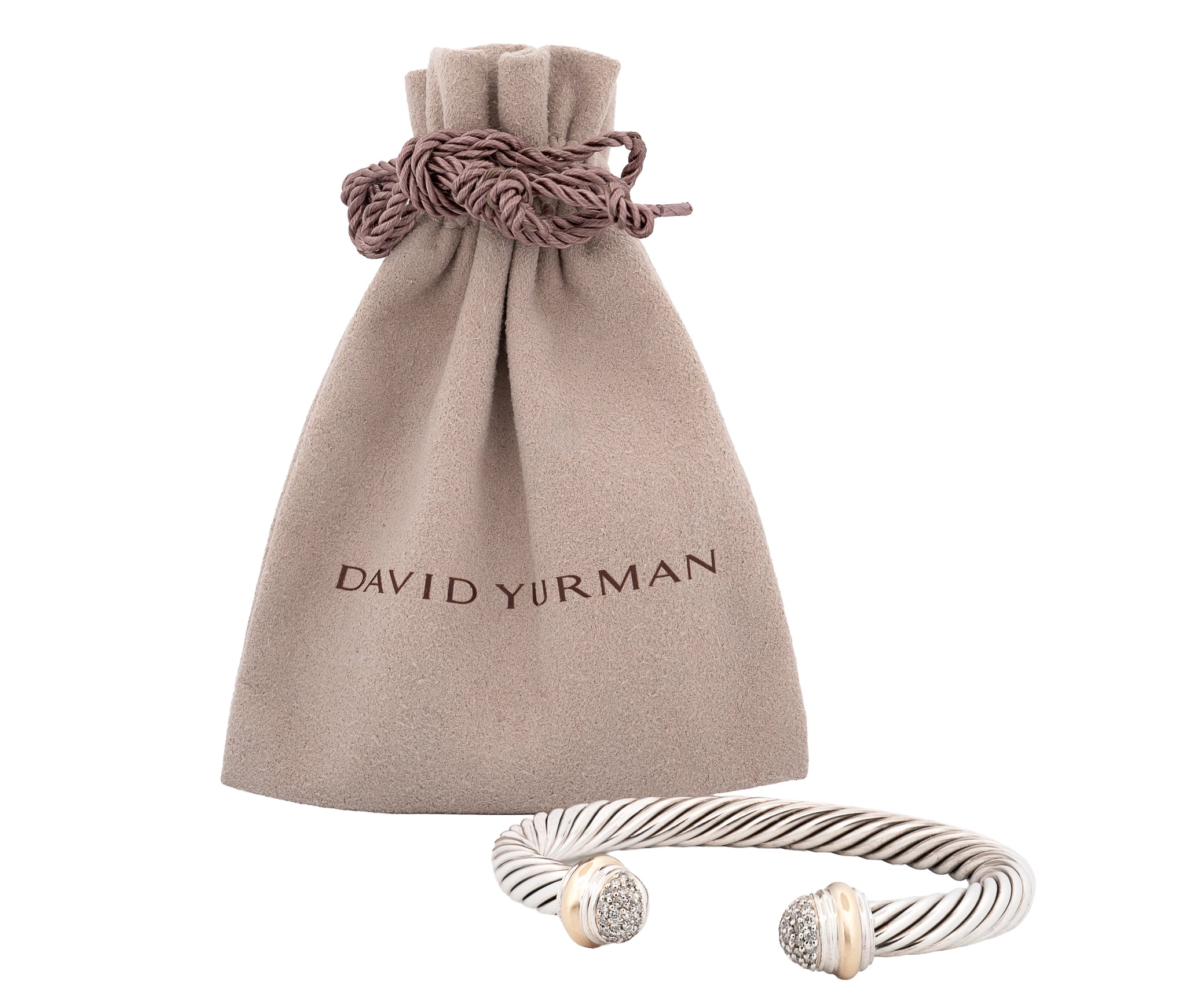 This David Yurman Women’s Classic Cable Bracelet showcases the signature twisted design in sterling silver with 18K yellow gold end caps. Accented by pavé diamond domes totaling 0.49 carats, it adds subtle brilliance to any look. Measuring 7mm wide, this elegant bracelet is a size 6.25 inches and weighs 26.4 dwt. A timeless blend of luxury and style, it’s perfect for stacking or wearing solo—an iconic piece from the renowned David Yurman collection.