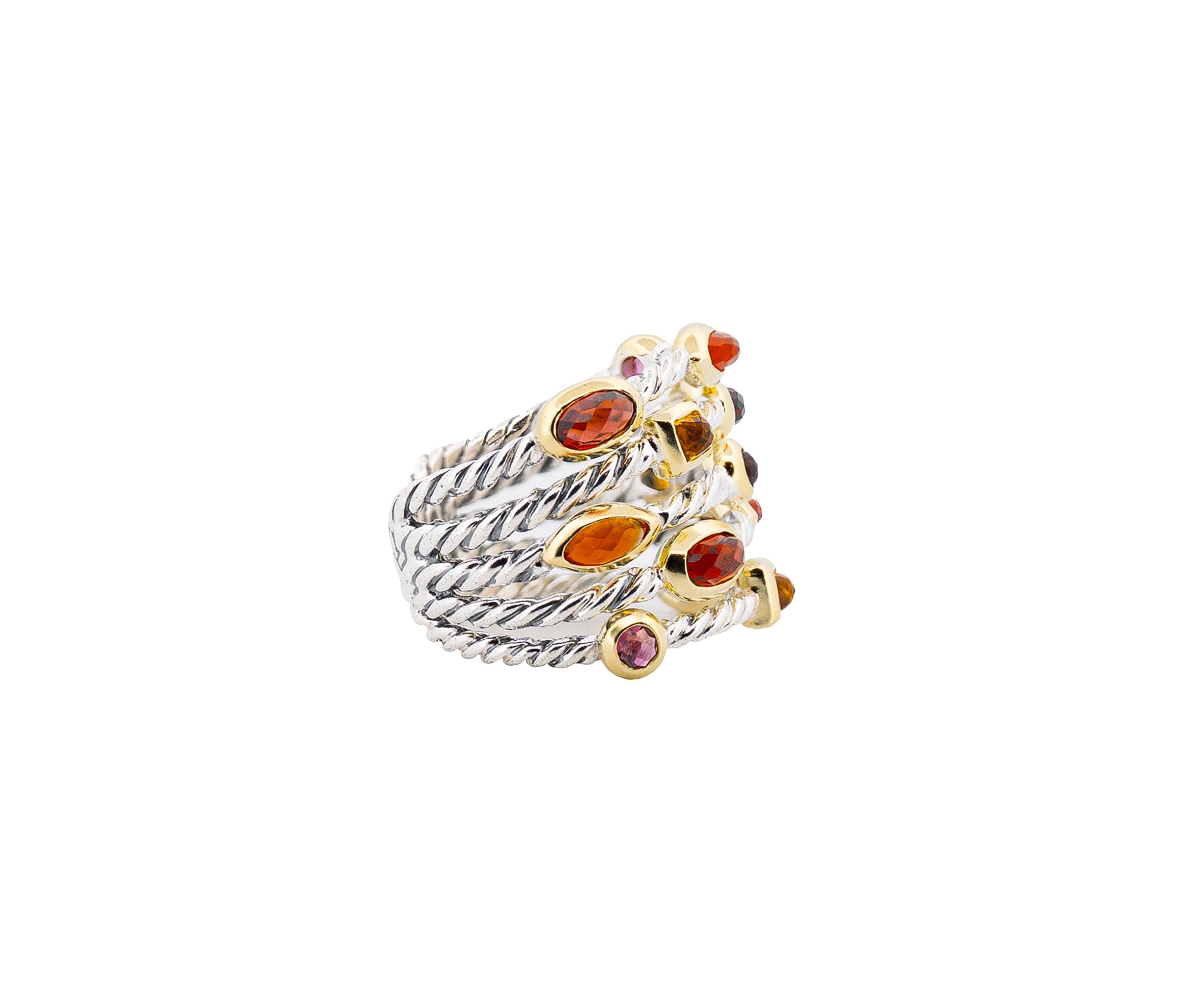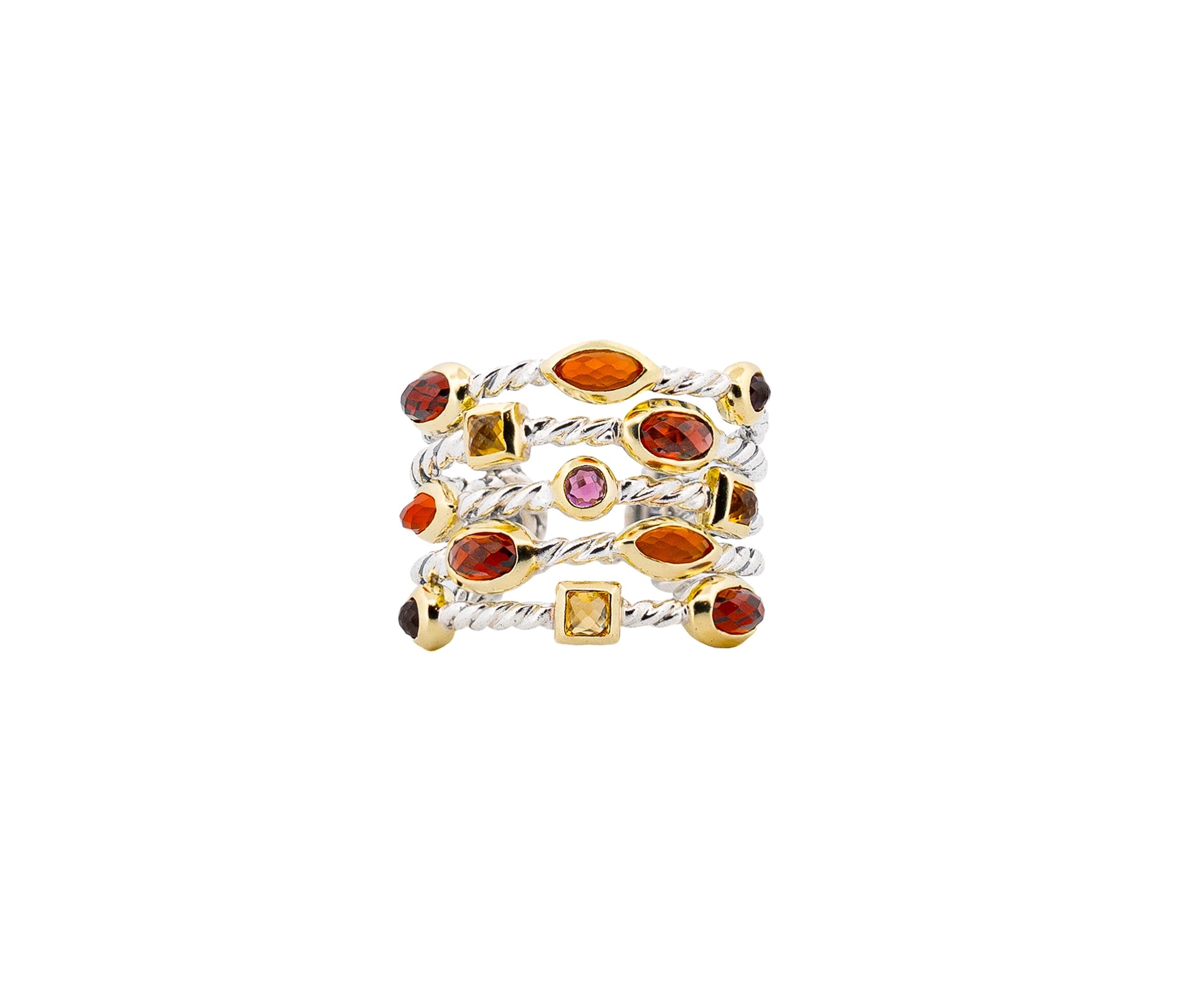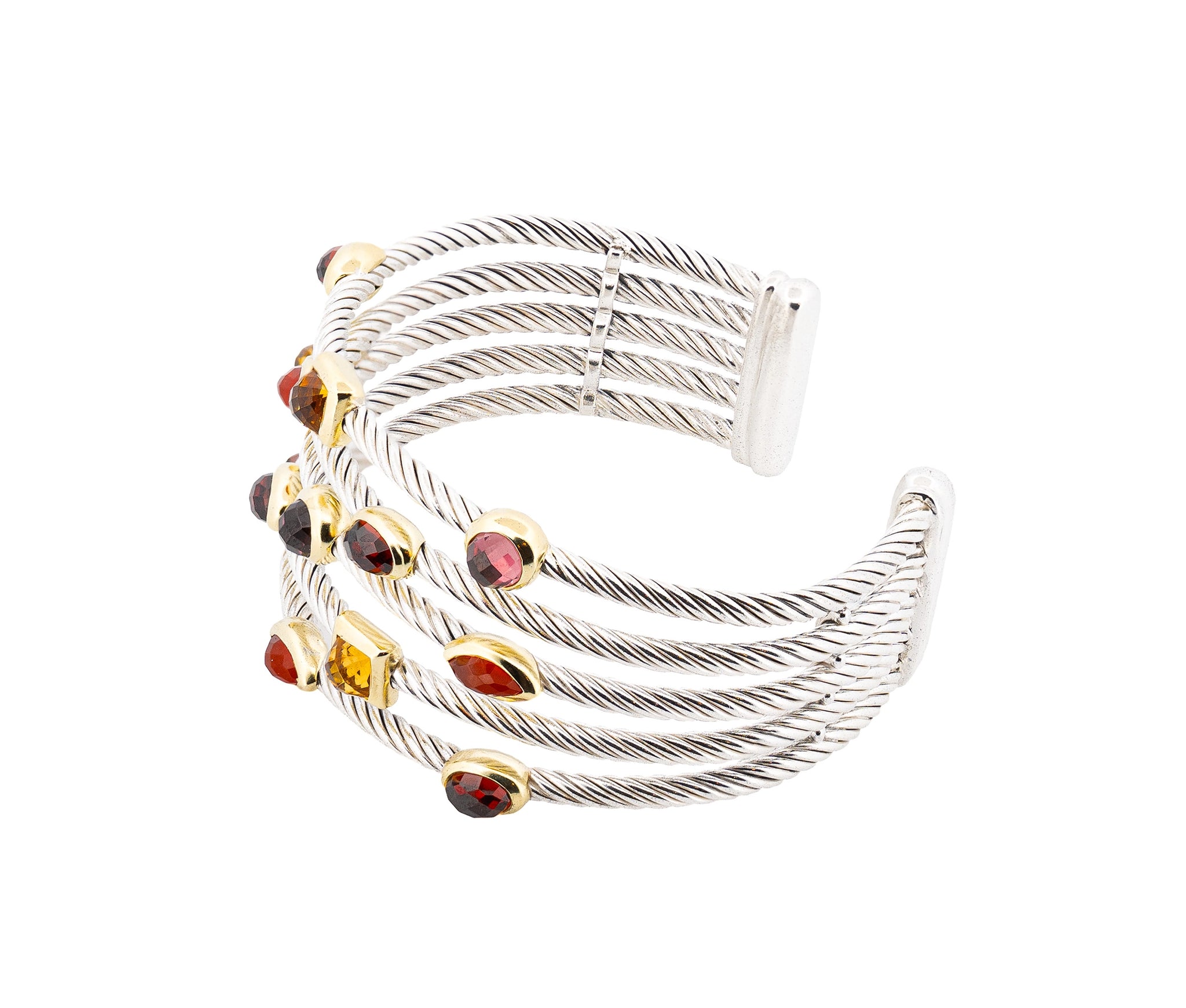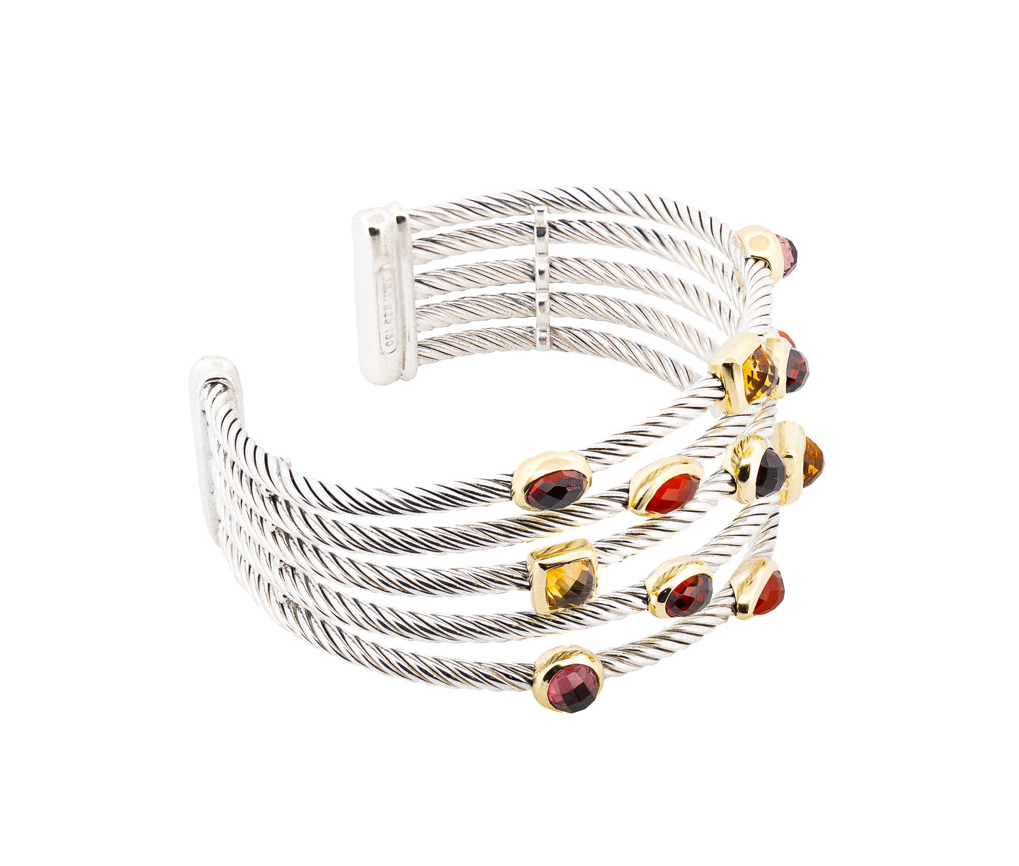 This vibrant David Yurman Multi Gem Confetti Cuff Bracelet and Ring Set is crafted in sterling silver with 18K yellow gold accents. The 6.25-inch bracelet and size 6 ring weigh a total of 41.4 dwt and are adorned with 26 gemstones. 6 pink tourmalines, 8 red garnets, 6 orange carnelians, and 6 yellow citrines. A colorful, elegant expression of David Yurman’s signature artistry and bold design.