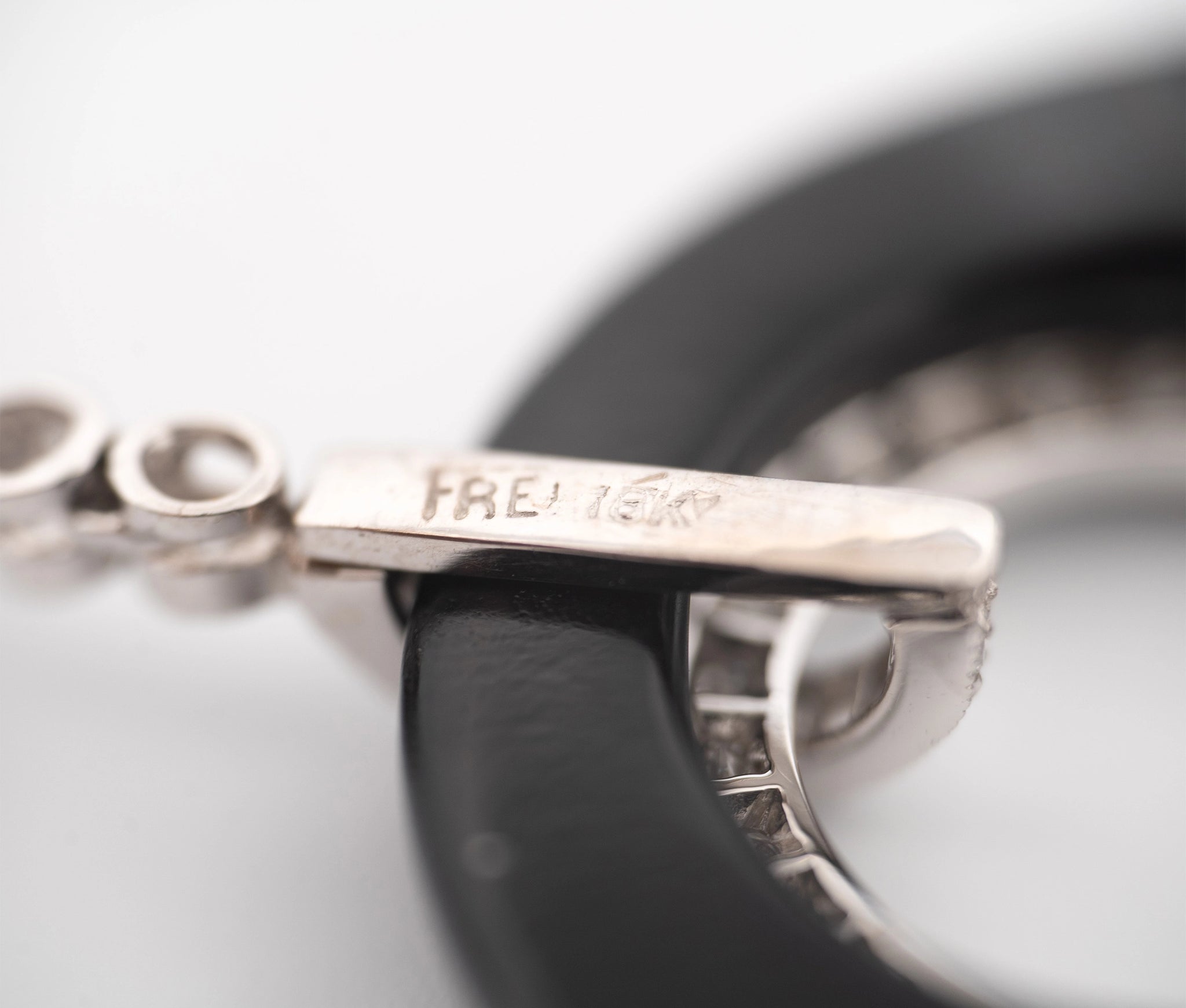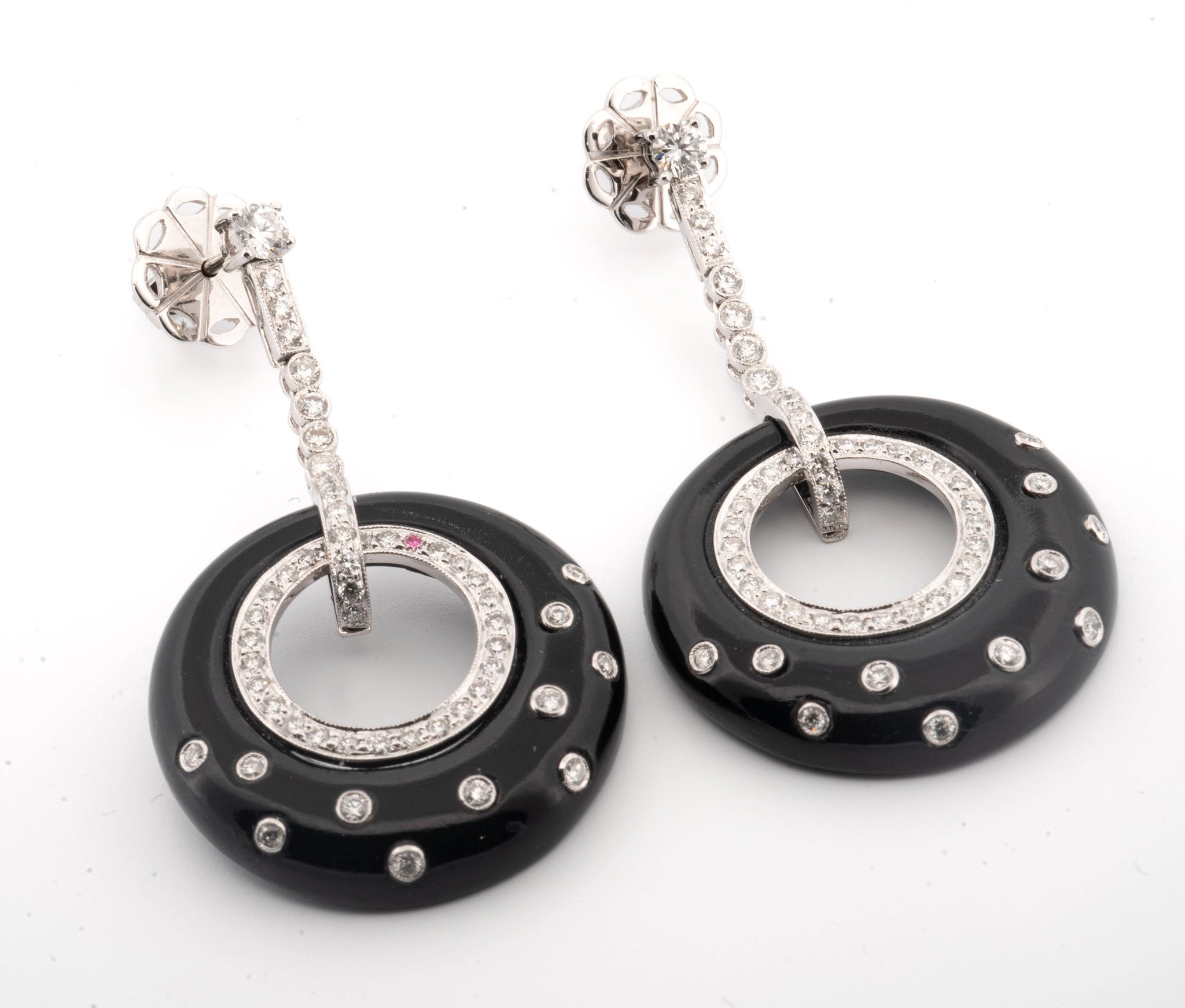 A brilliant example of monochromatic sophistication. Each earrings showcases a bold, carved black onyx hoop, enhanced by shimmering full cut diamonds ranging from 1.25 to 3.25 mm, set in luxurious 18k white gold. The diamonds are artfully arranged along the circular form, creating and eye catching sparkle against the deep black onyx. These earrings are finished with secure posts and friction backs, bringing a daring yet timeless edge to any ensenble.