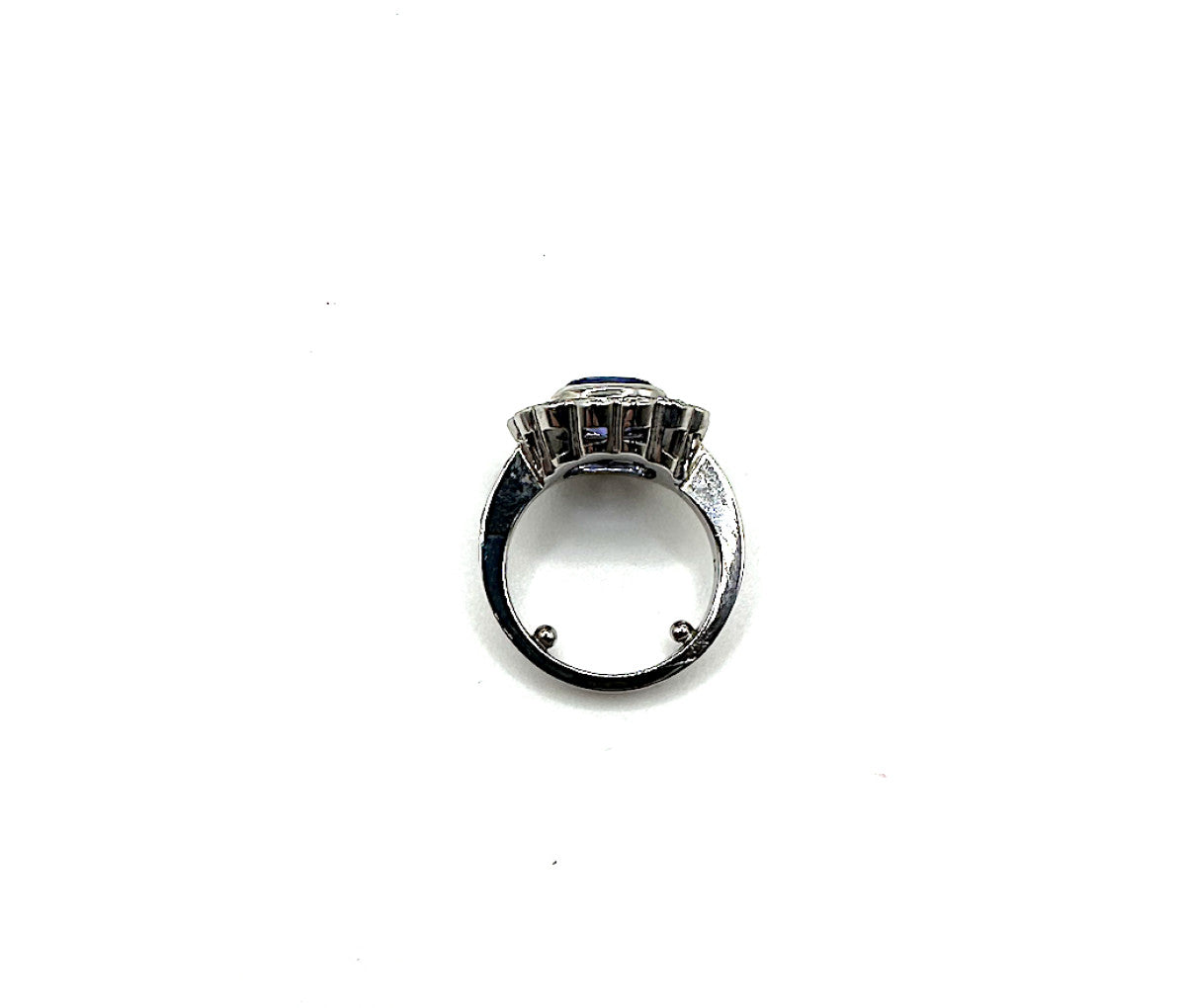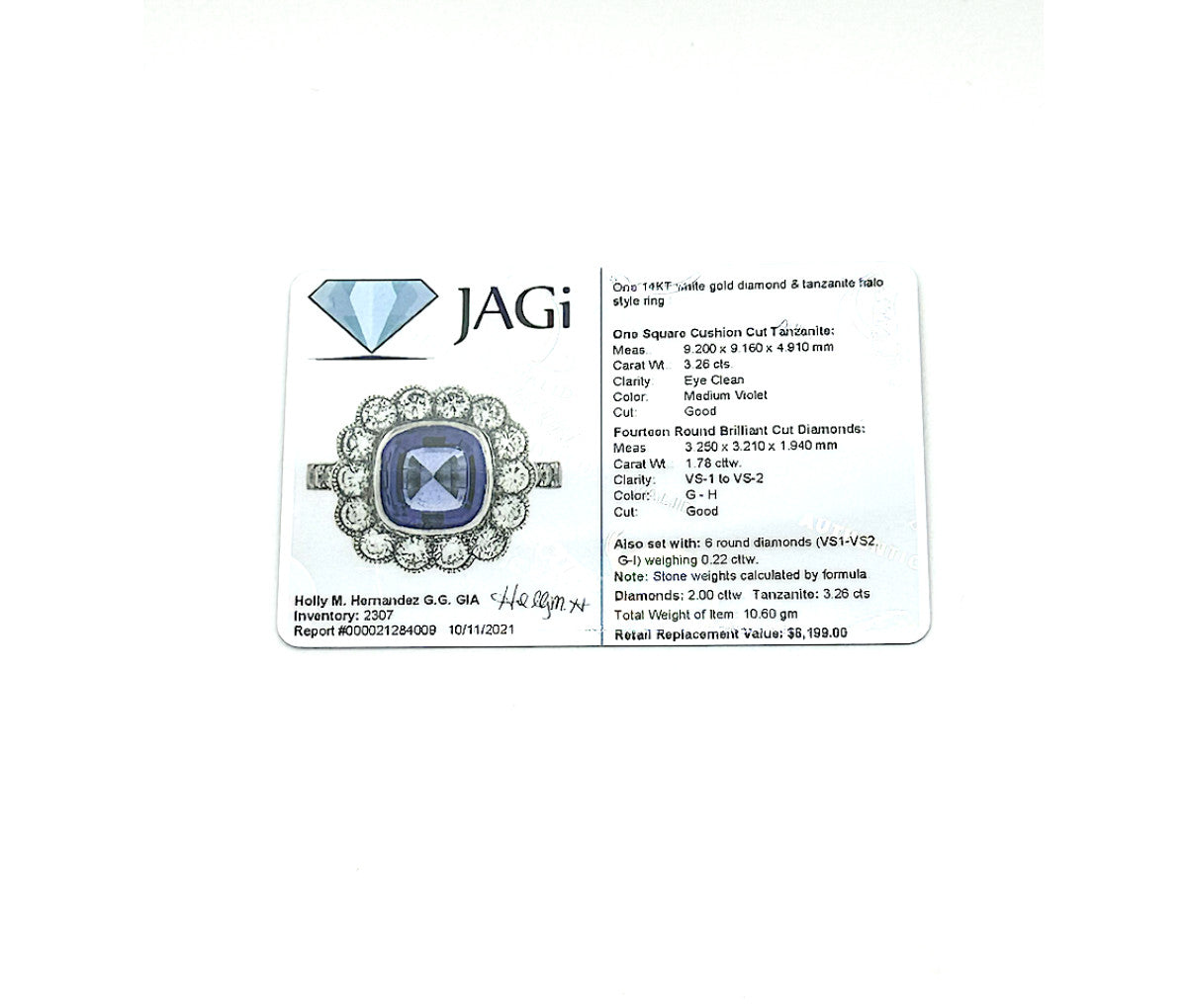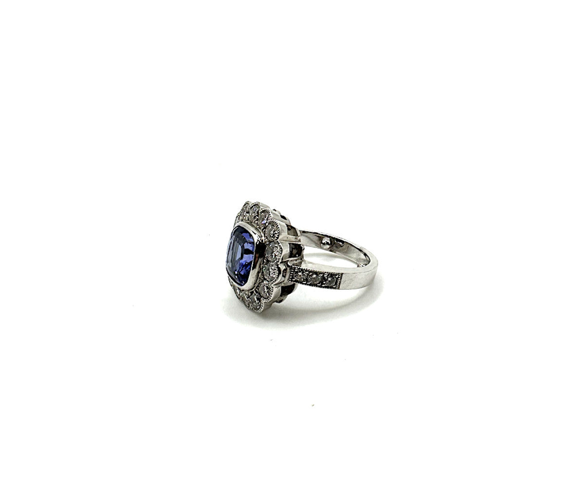 This is an exquisite piece of fine jewelry that combines the rare beauty of tanzanite with the brilliance of diamonds. The combination of the vibrant tanzanite and the dazzling diamonds makes this ring a statement piece, perfect for special occasions like engagements, anniversaries, or milestone celebrations. Its classic yet contemporary design is versatile enough to be worn every day or as a luxurious accent to formal wear.