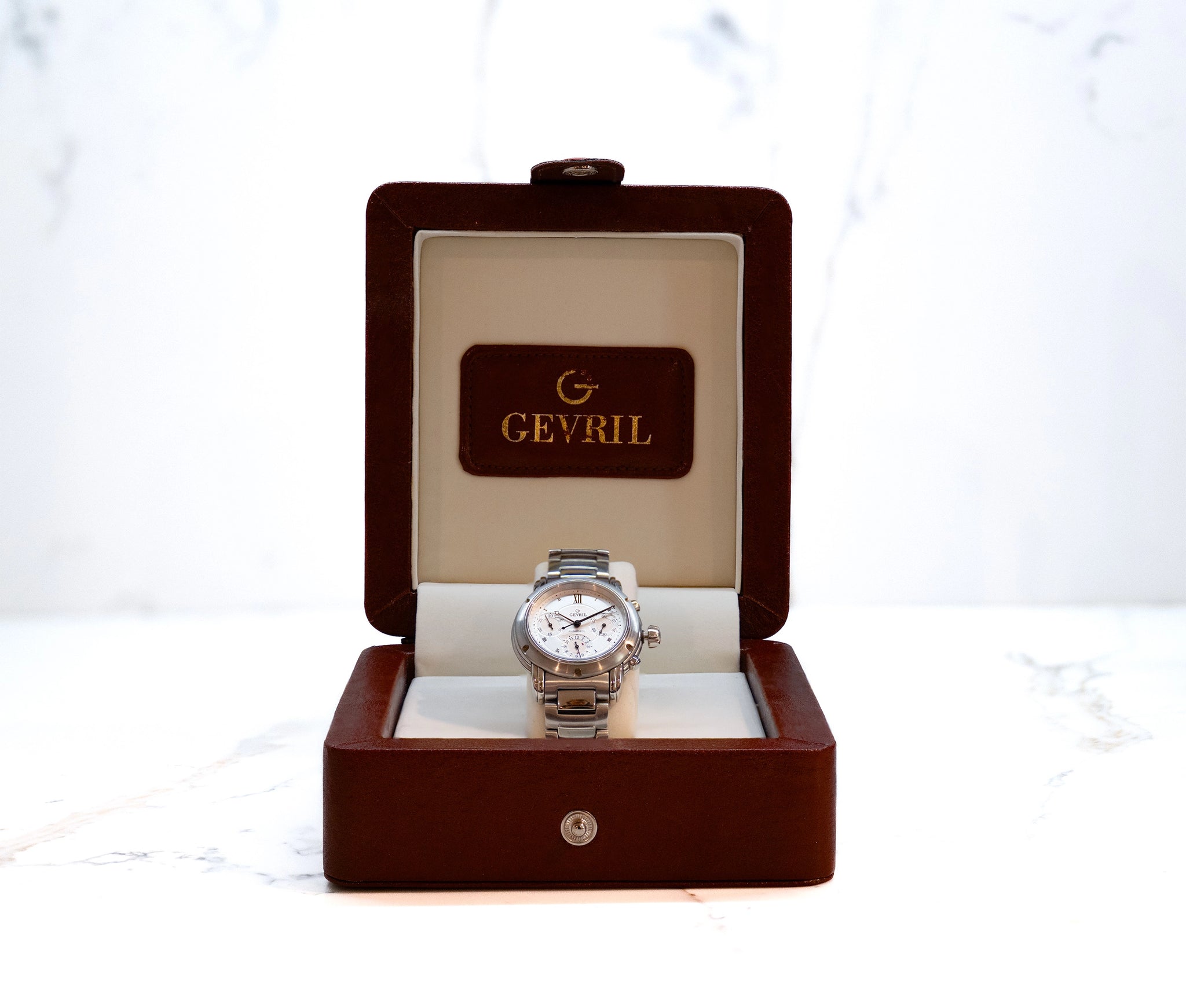 The Gevril First Generation blends Swiss craftsmanship with timeless design. Featuring a bold 42mm stainless steel case, sapphire crystal, and precision automatic movement, it offers durability and elegance. Its detailed dial, clear markers, and refined strap make it a versatile choice for those seeking sophistication and reliable performance.