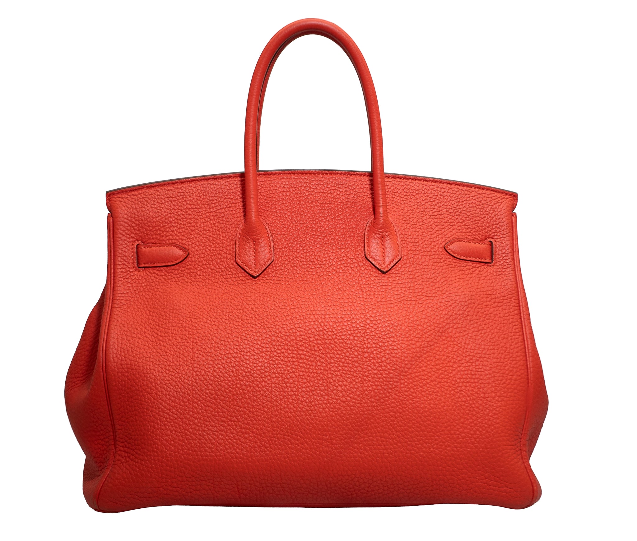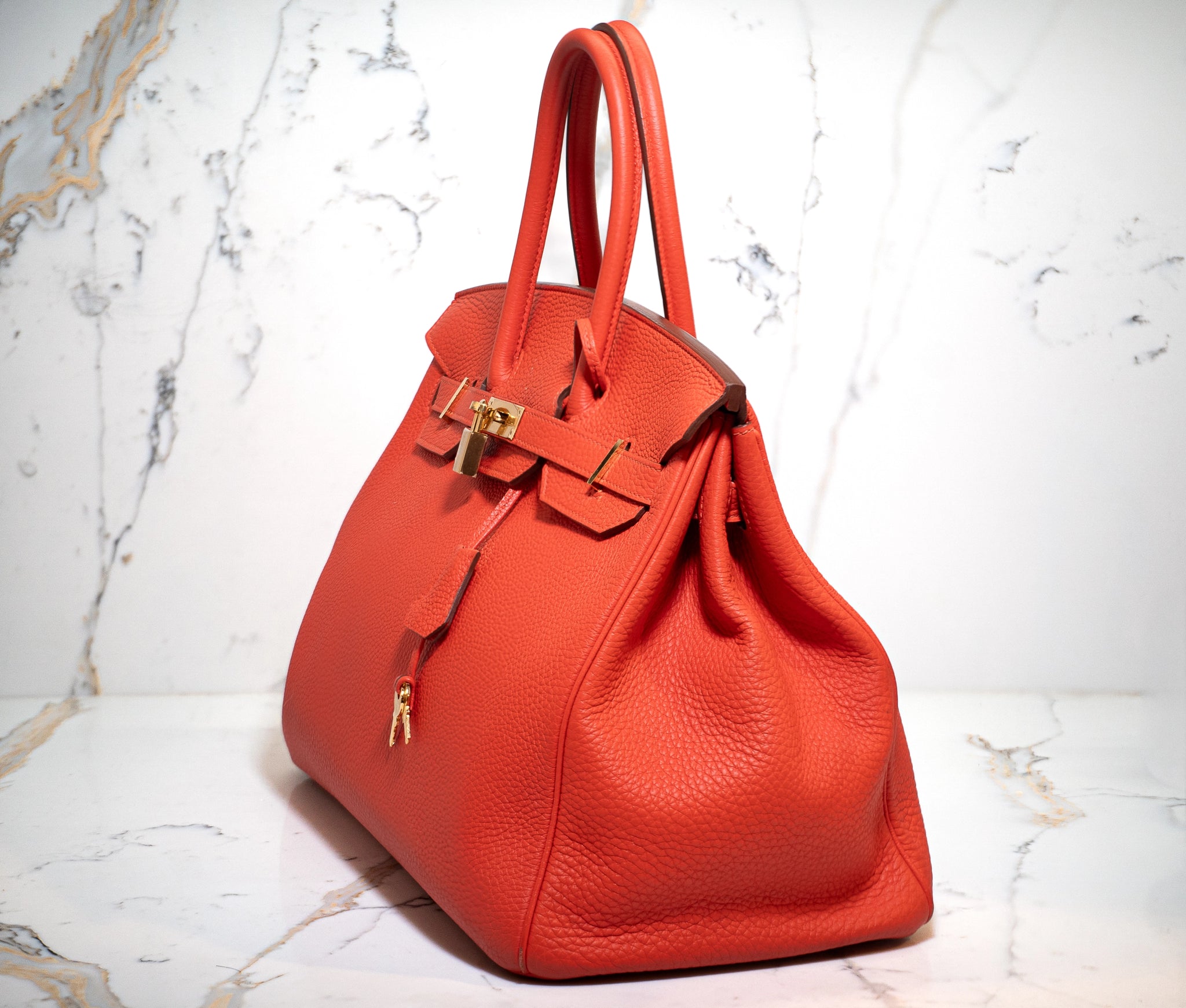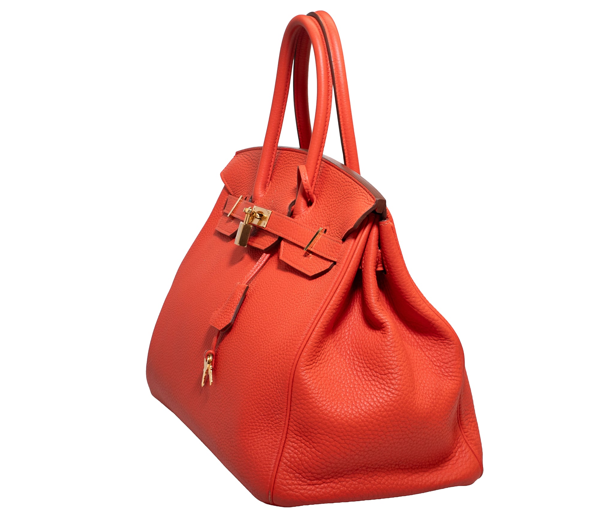 This is an authentic HERMES Togo Birkin 35 in Capucine. This stylish handbag is beautifully crafted of togo calfskin leather in bright red with an orange undertone. The bag features rolled leather top handles, a frontal flap and strap closure, gold hardware including strap links and a front turn lock, and a matching clochette for the key. This opens the top flap to a matching leather interior with pockets.