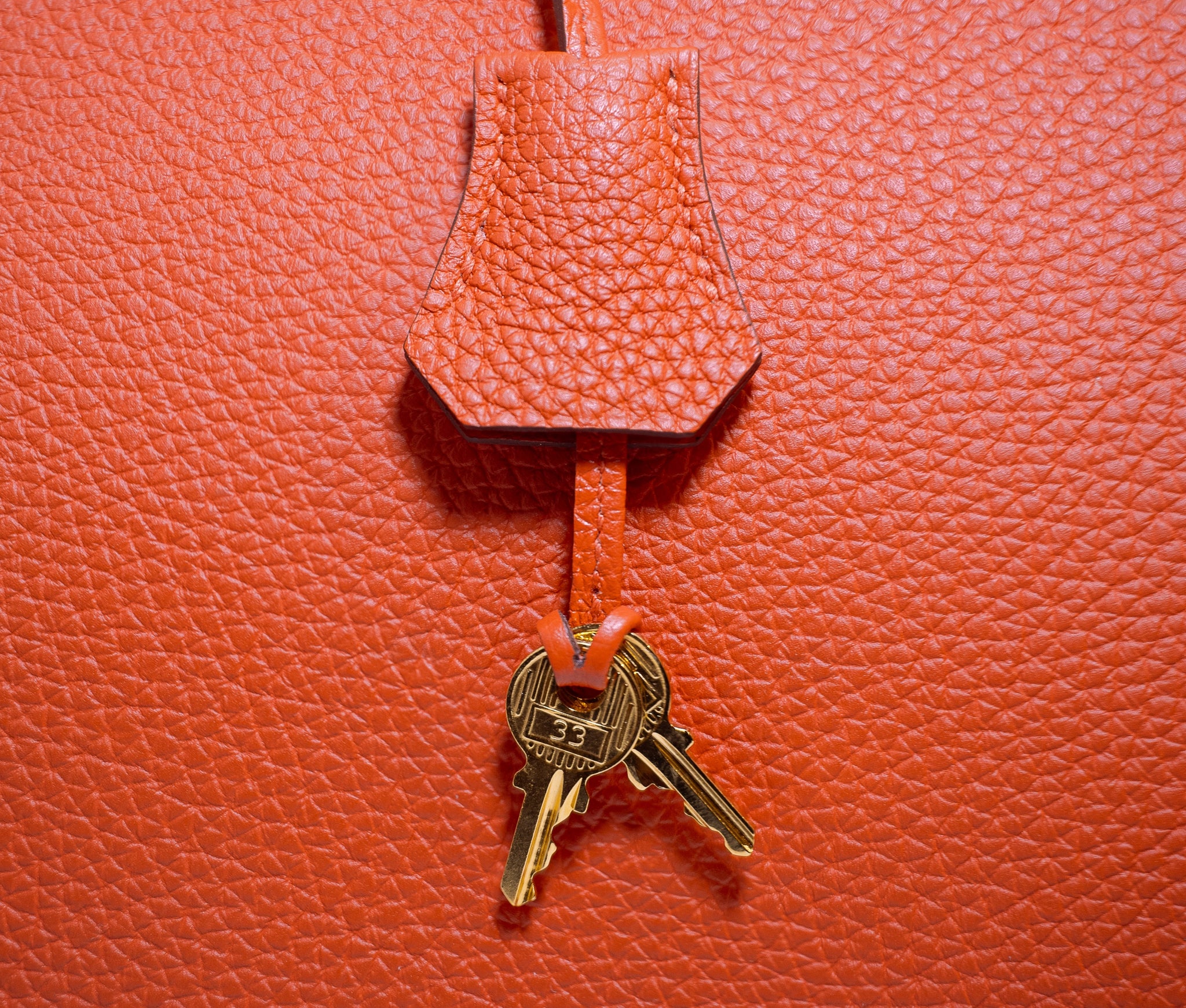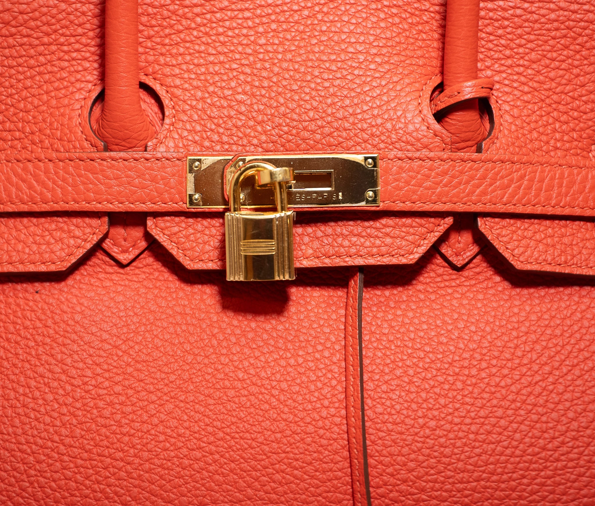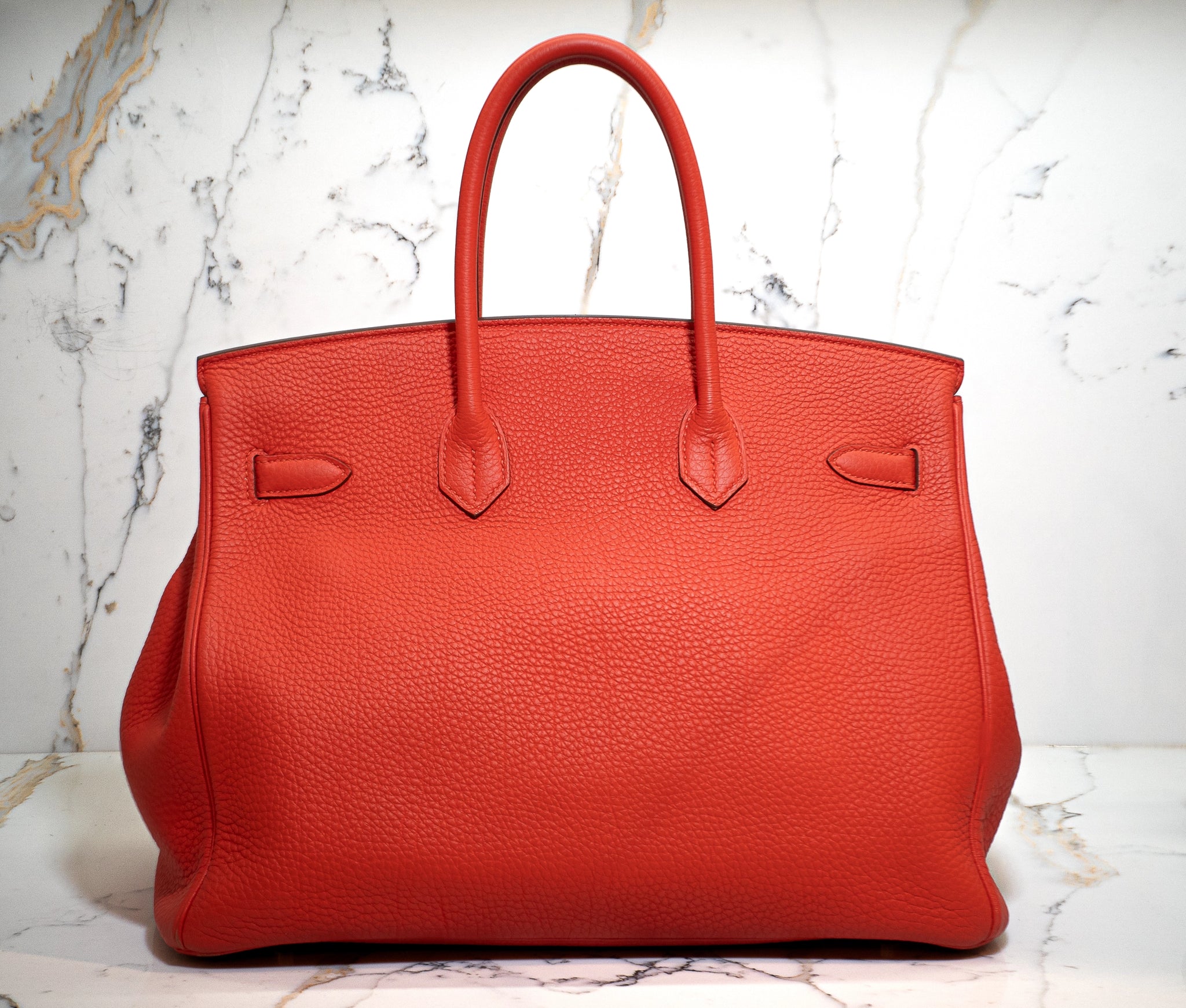 This is an authentic HERMES Togo Birkin 35 in Capucine. This stylish handbag is beautifully crafted of togo calfskin leather in bright red with an orange undertone. The bag features rolled leather top handles, a frontal flap and strap closure, gold hardware including strap links and a front turn lock, and a matching clochette for the key. This opens the top flap to a matching leather interior with pockets.