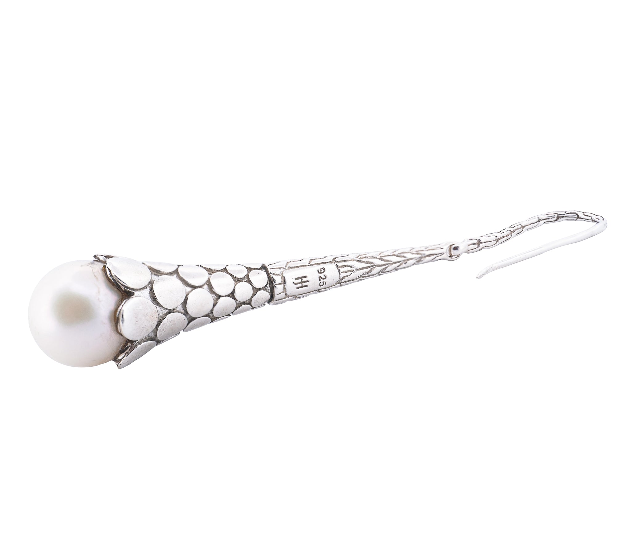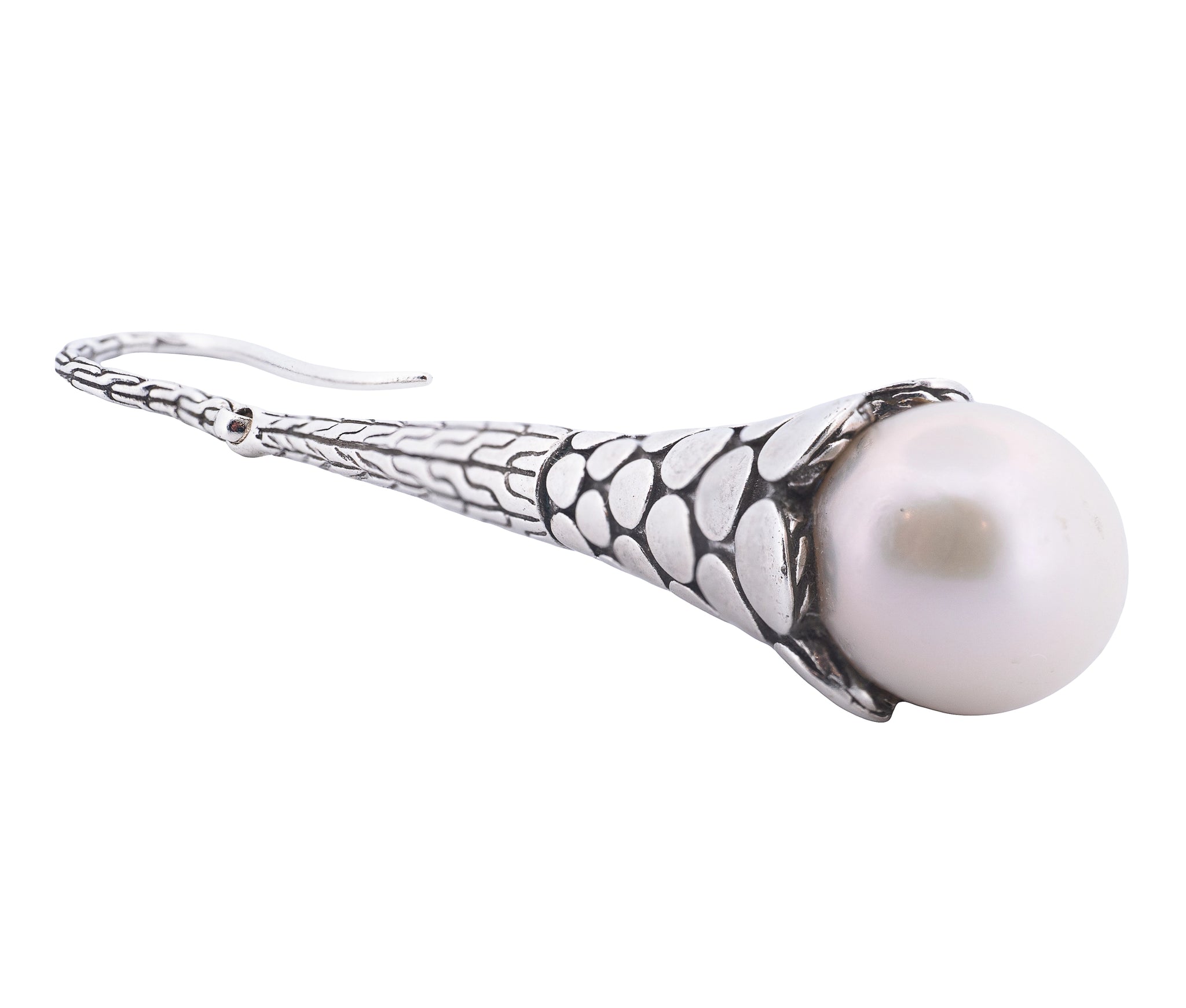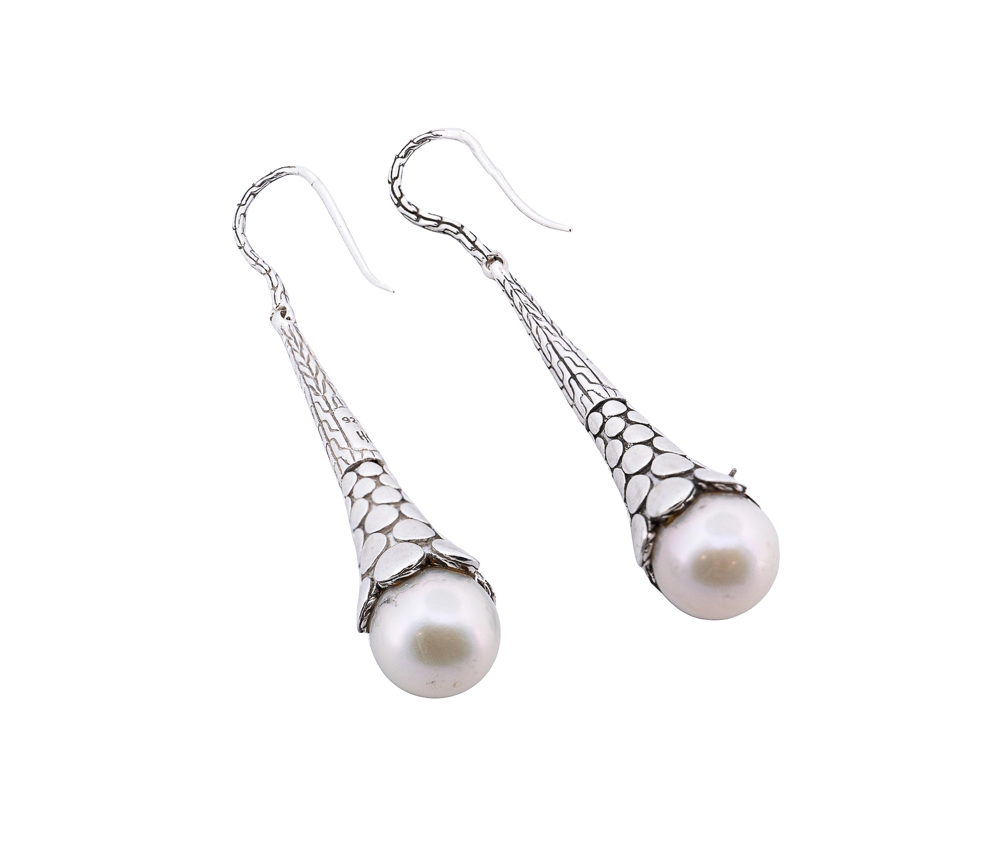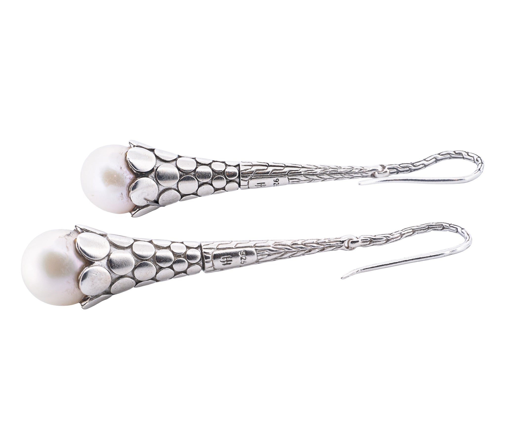These John Hardy Sterling Silver Pearl Dot Earrings showcase two luminous 10.5mm cultured pearls in an elegant 2.25-inch drop design. Crafted with Hardy’s signature dot motif and detailed silverwork, they offer a sophisticated blend of texture and shine. The earrings weigh 8.4 dwt, providing a substantial yet comfortable feel. Their timeless style and graceful movement make them perfect for both everyday wear and special occasions, adding a refined touch to any jewelry collection.
