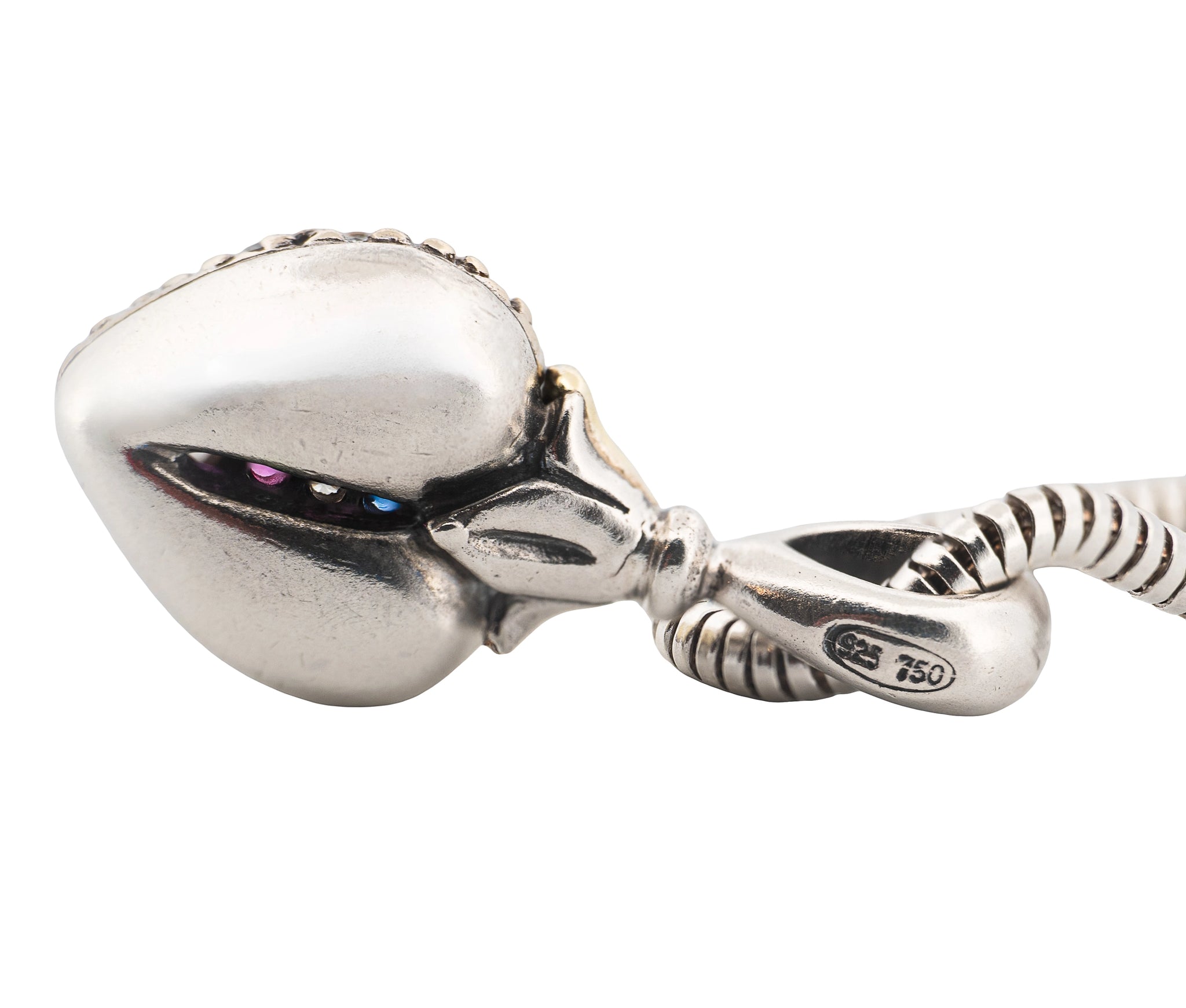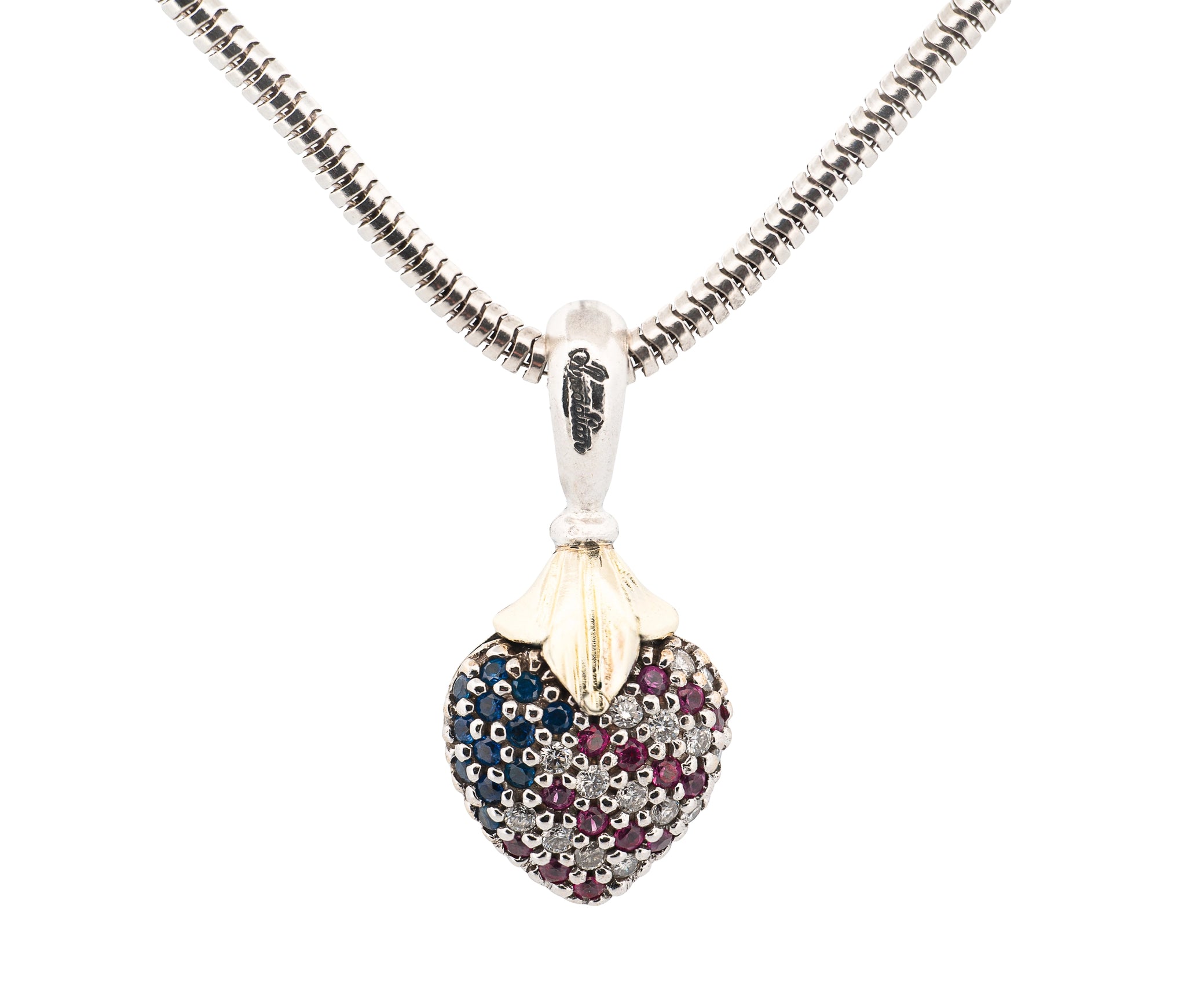This Lagos Caviar Arcadian Gemmed American Flag Heart Necklace is a stunning tribute to patriotic elegance. Crafted in sterling silver and 18K yellow gold, the heart pendant is set with 15 diamonds (0.30ct), 13 rubies (0.26ct), and 12 sapphires (0.24ct), totaling 0.80ct of vibrant gemstones. Suspended on a 36-inch, 2.5mm omega link chain and weighing 20.4 dwt, this necklace beautifully blends Lagos’ signature craftsmanship with symbolic, eye-catching design.