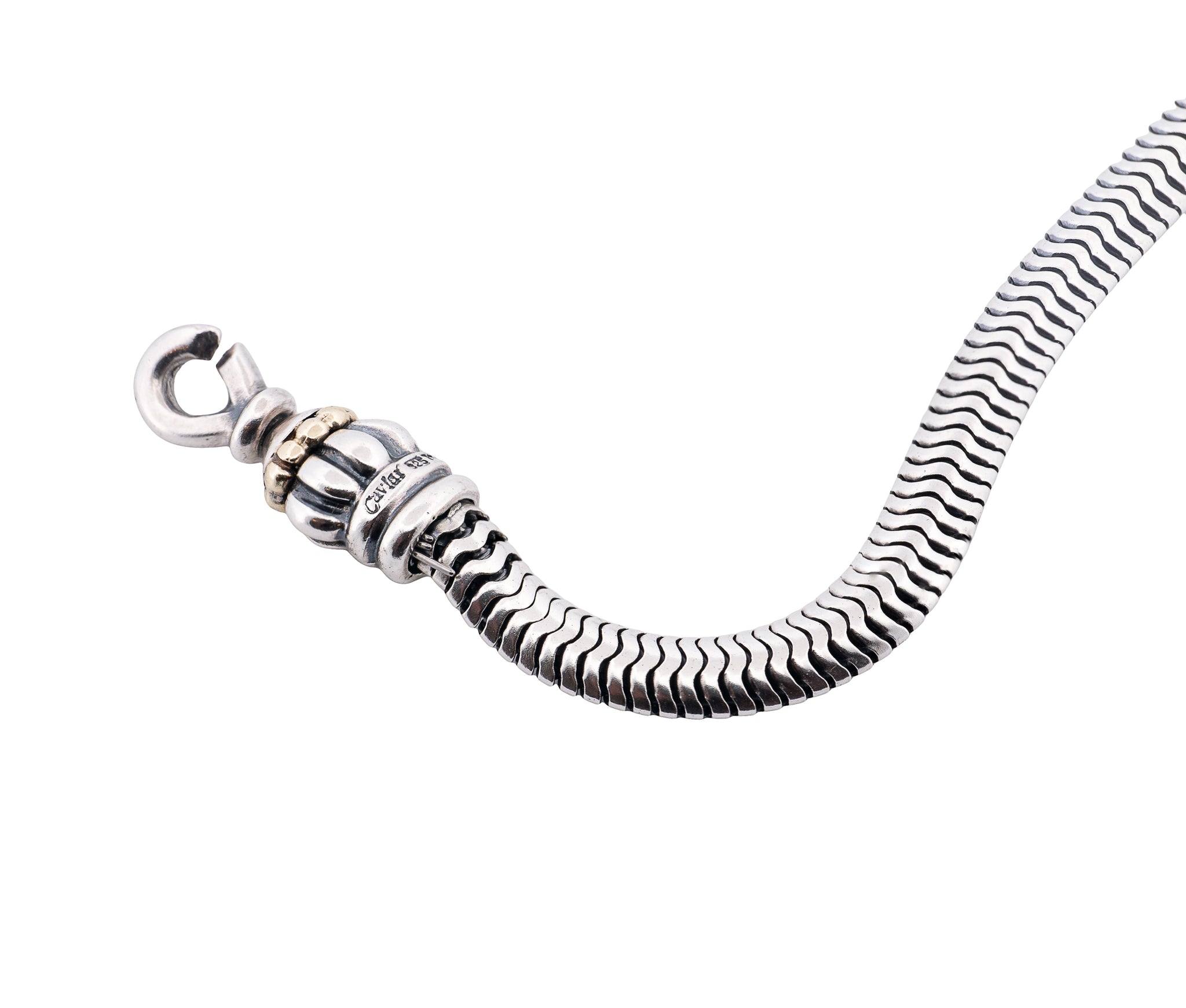 The Lagos Caviar Blue Topaz Necklace is a stunning statement piece crafted in sterling silver and 18K yellow gold. Featuring a vibrant blue topaz measuring 19.9mm x 13.3mm x 9.9mm and totaling 5.45 carats, this necklace combines bold color with signature Caviar detailing. Measuring 18 inches in length and weighing 37.5 dwt, it offers timeless elegance with a luxurious touch—perfect for elevating any fine jewelry collection.