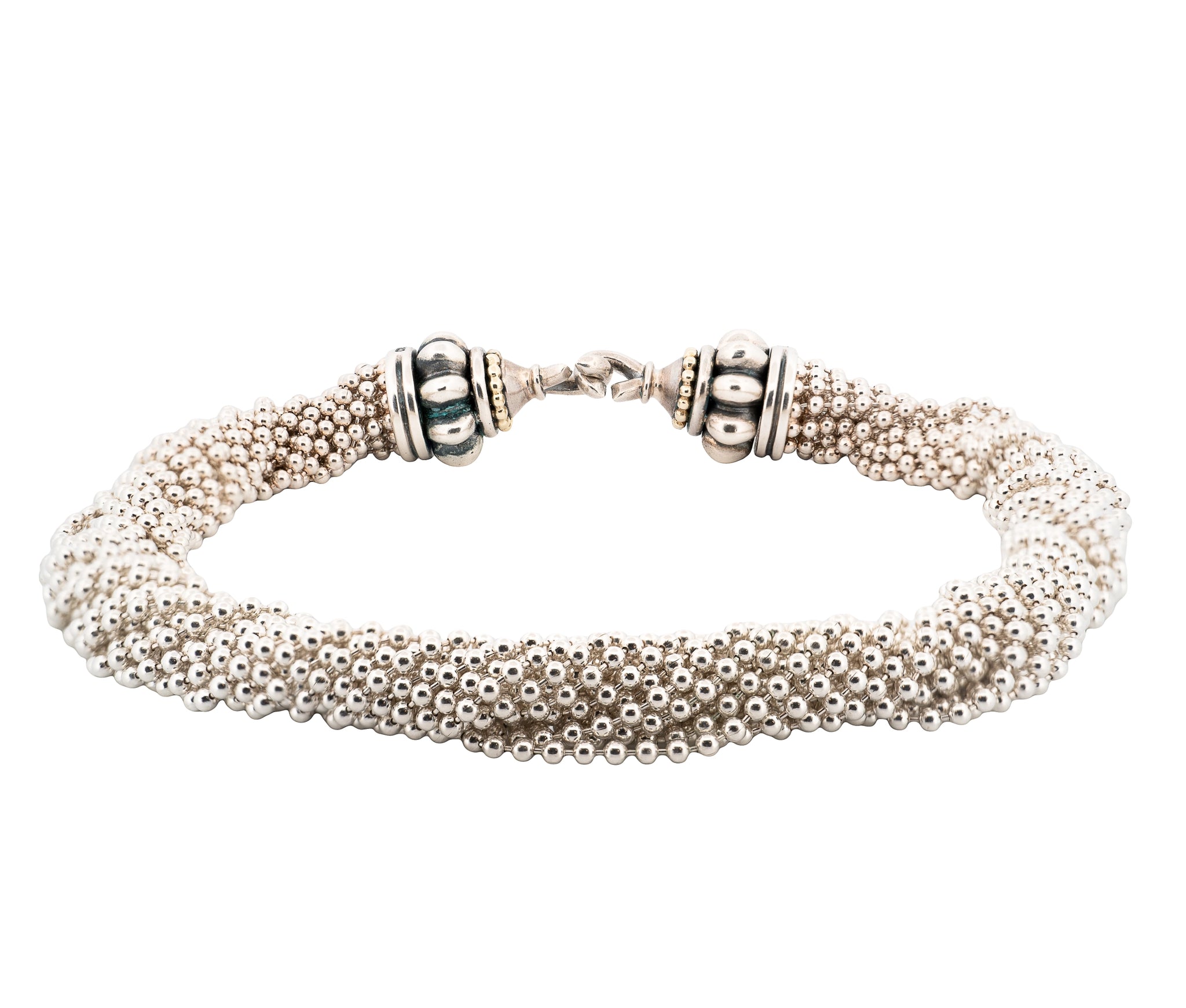 This Lagos Caviar Multi-Strand Necklace is a stunning statement piece crafted in sterling silver and 18K yellow gold. Measuring 15.5 inches in length and weighing 90.2 dwt, it features several interlinked strands adorned with the brand’s iconic beaded detailing. The layered design creates depth and texture, while the mix of metals adds rich contrast and sophistication. Bold yet elegant, this necklace embodies timeless Lagos craftsmanship and makes a luxurious addition to any jewelry collection.