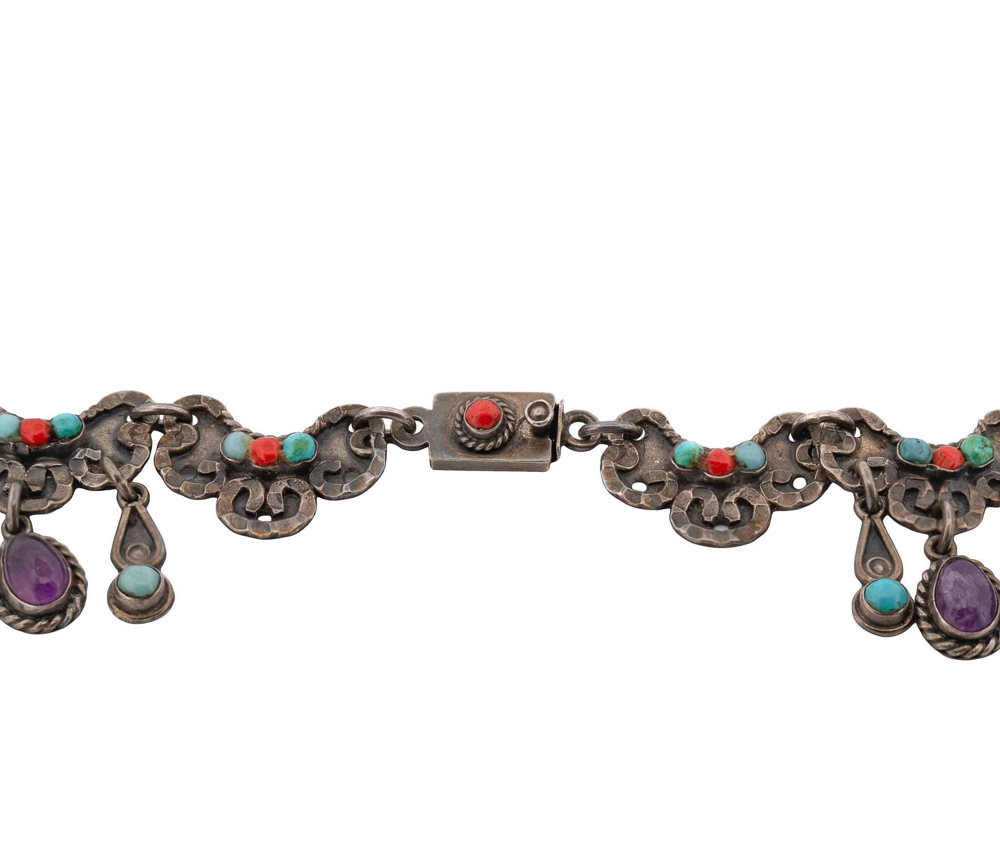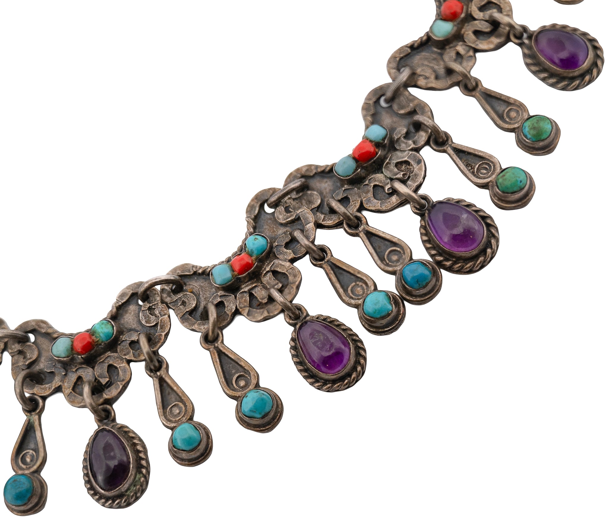 The necklace is composed of sturdy curved links decorated with thick textured trim and twisted silver rope. At the center are channel-set 2.5mm coral and turquoise stones (in the style that Matl often used). The dangles are bezel-set with purple 8mm x 6.5mm amethyst cabochons and 3.7mm round turquoise stones and are also decorated with twisted/curled silver. The stones are varying natural shapes with visible stone structure in the amethyst.
