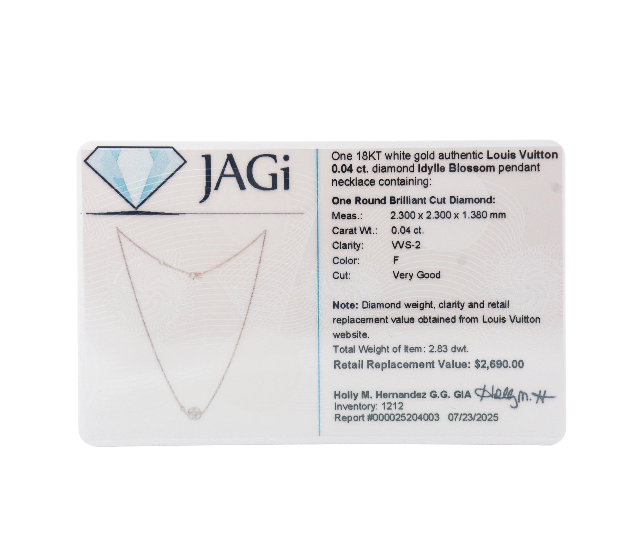 18KT white gold authentic Louis Vuitton diamond Idylle Blossom pendant necklace with one round brilliant cut diamond with a clarity of VVS2 and F color weighing 0.04 ct. Chain is adjustable in length.