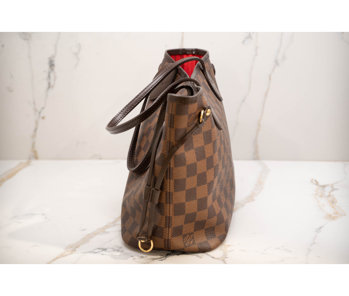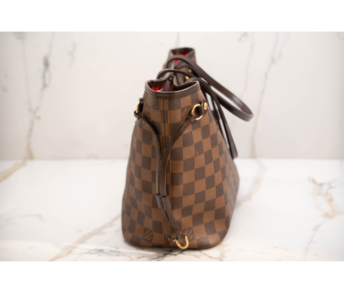 The Louis Vuitton Damier Ebene Neverfull PM is a timeless and practical tote bag, perfect for daily use or casual outings. Crafted from the durable Damier Ebene canvas with smooth cowhide leather trim, it combines elegance and functionality. The slim, comfortable shoulder straps and signature side laces allow for adjustable capacity and versatile styling. The interior features a vibrant red textile lining with a zippered pocket for added organization, along with a removable zipped pouch that can double as a clutch. Lightweight and iconic, it’s a classic addition to any wardrobe. Exterior shows light scuffing and minimal wear.