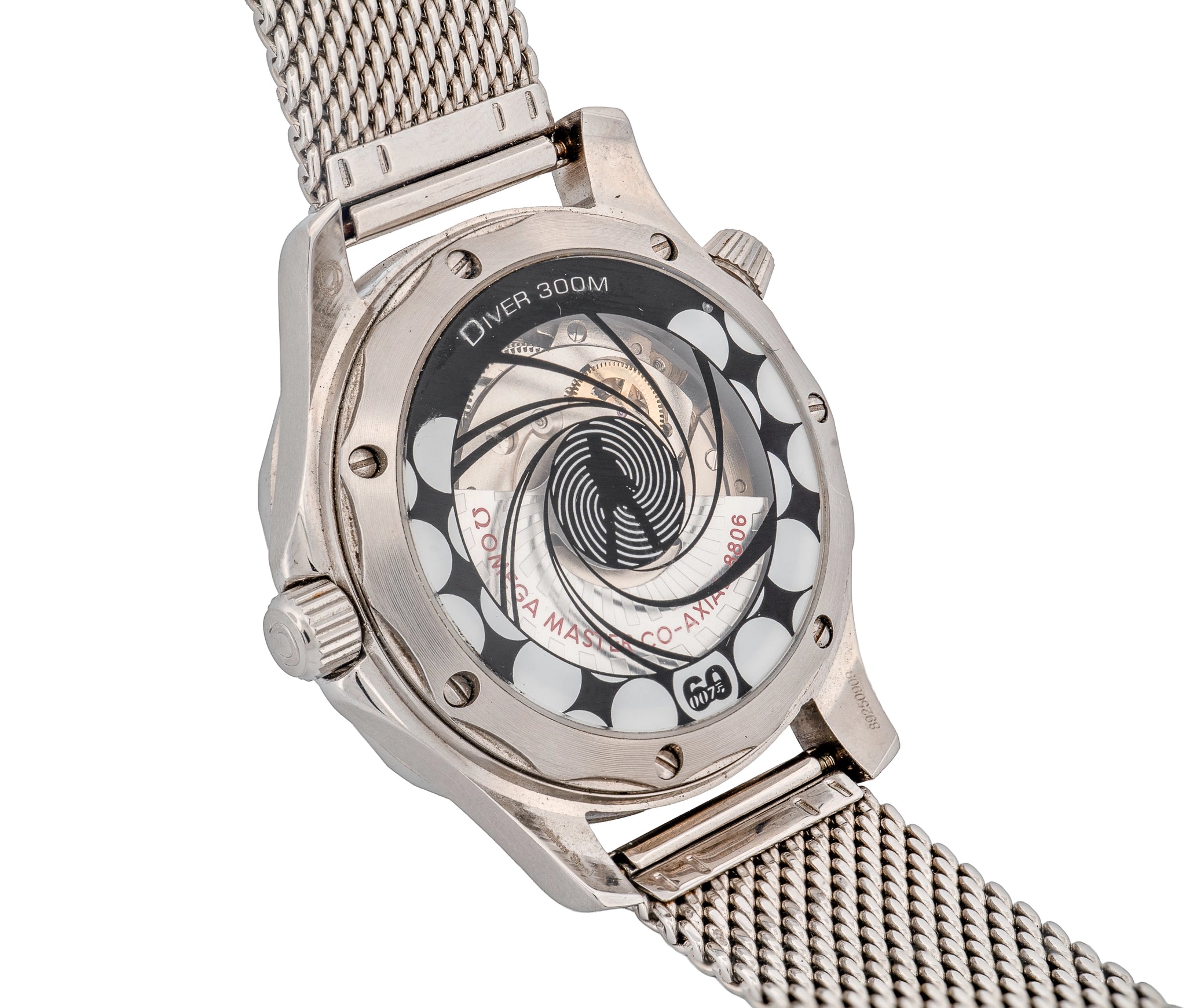 On the caseback, beneath sapphire crystal with micro-structured metallization, the iconic Bond gun-barrel opening sequence plays continuously in motion, synchronized with the spinning of the lollipop seconds hand to create a captivating “moiré” animation effect.