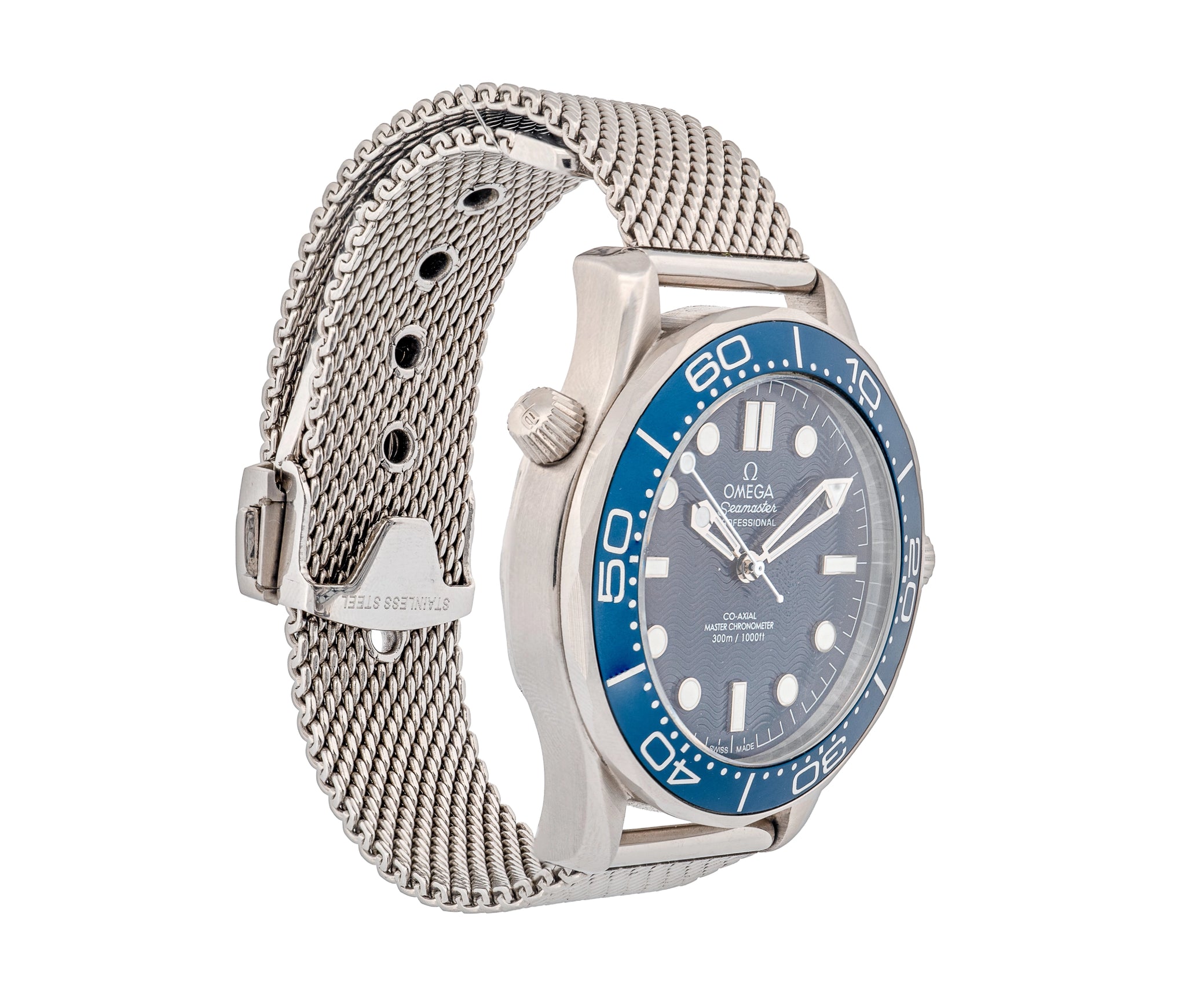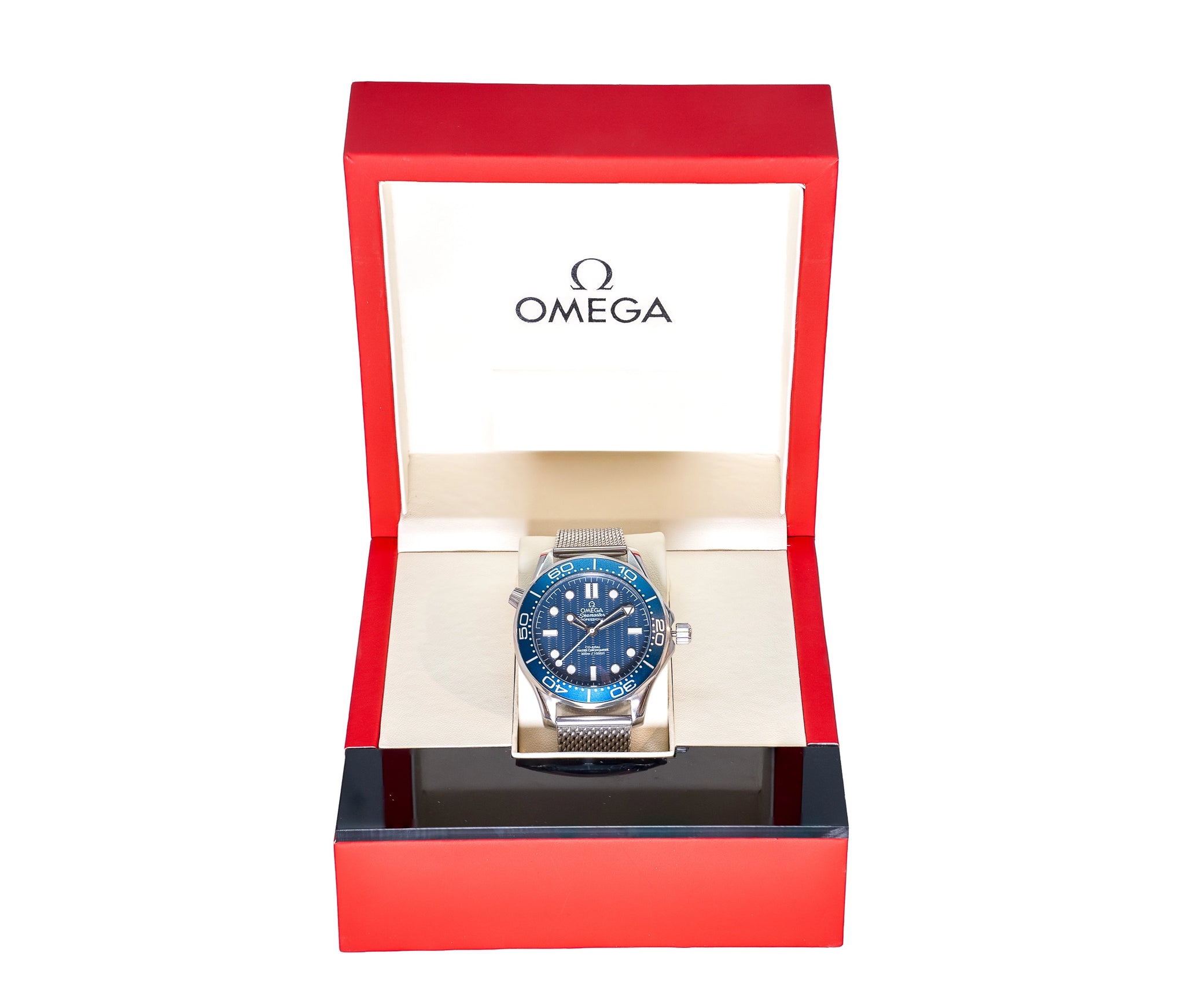 The watch is fitted with a brushed stainless-steel mesh bracelet, echoing the design of Bond’s titanium Seamaster from No Time To Die, combining elegance with rugged character. Inside, it’s powered by OMEGA’s Co-Axial Master Chronometer Calibre 8806, ensuring exceptional precision and performance.