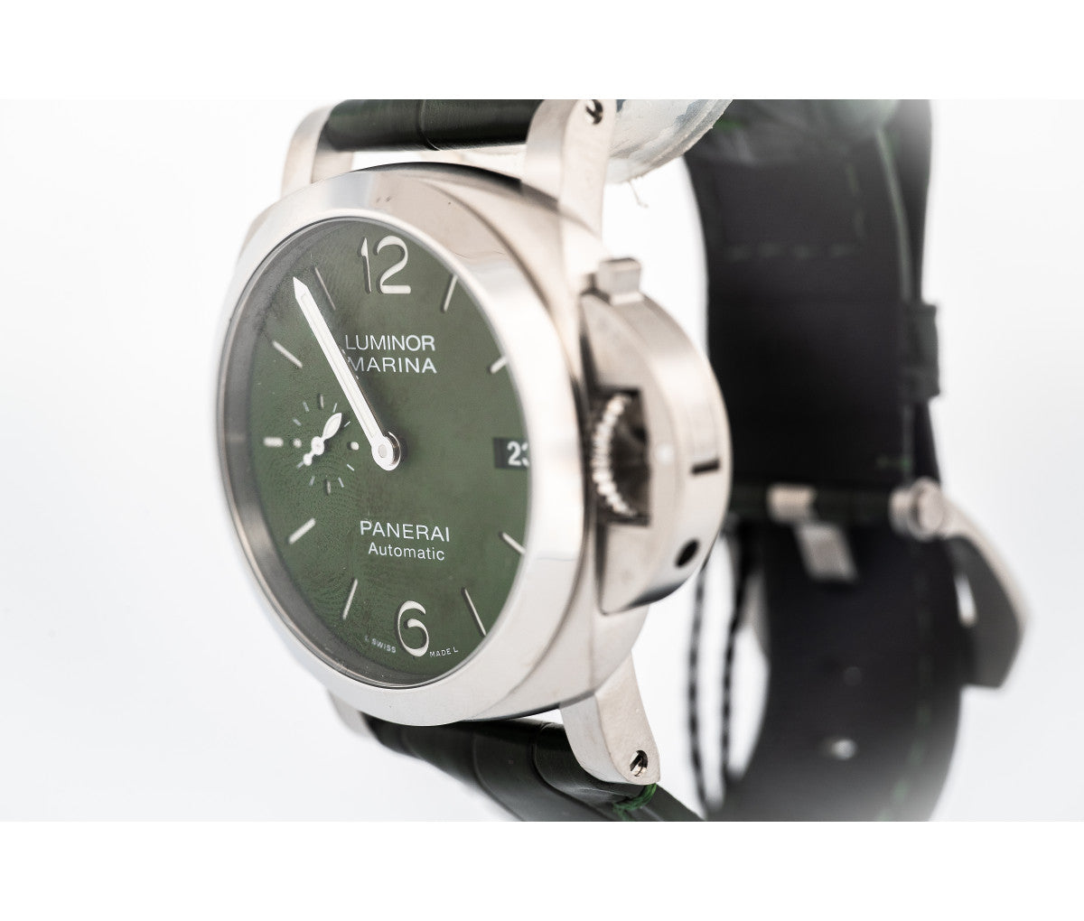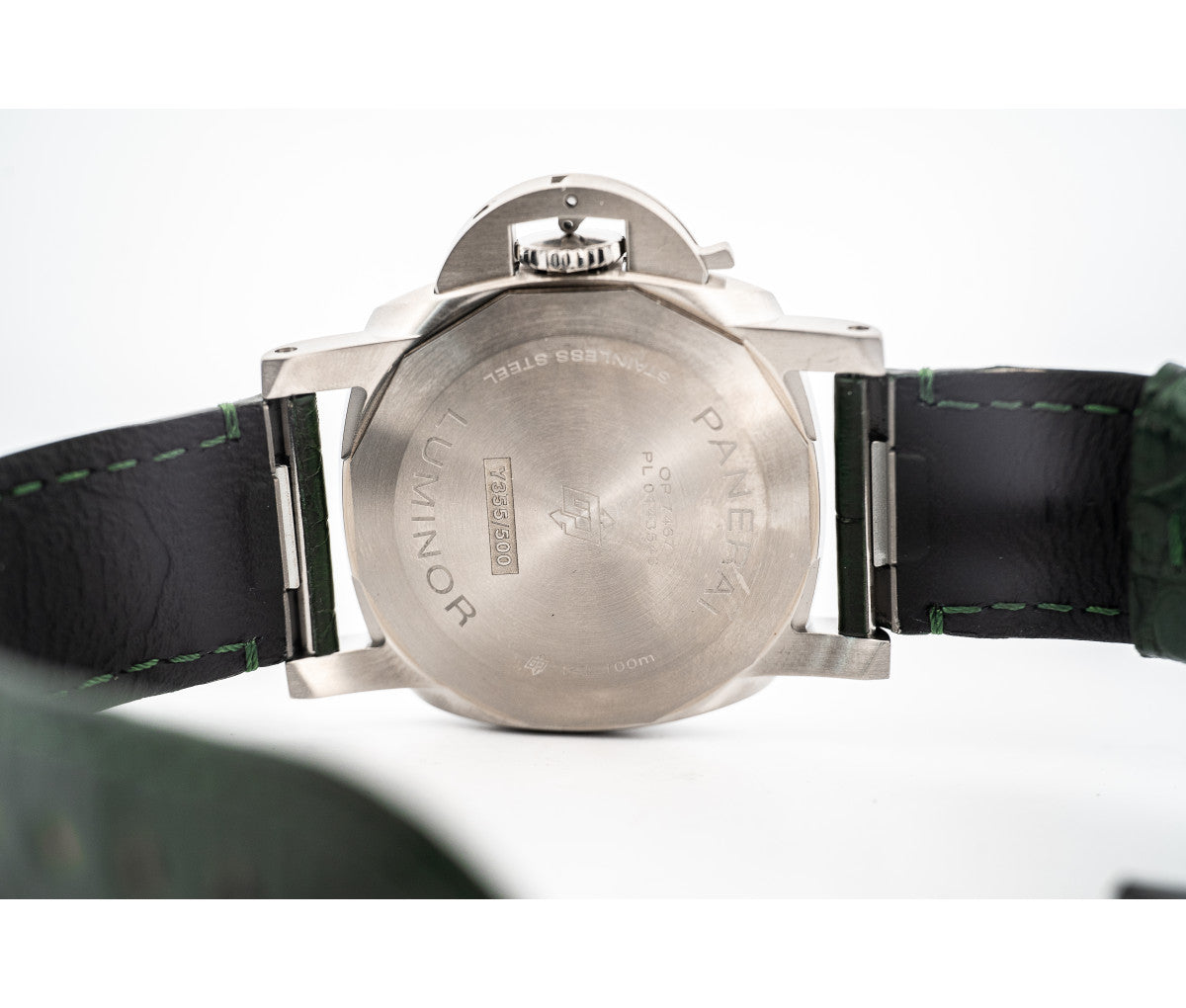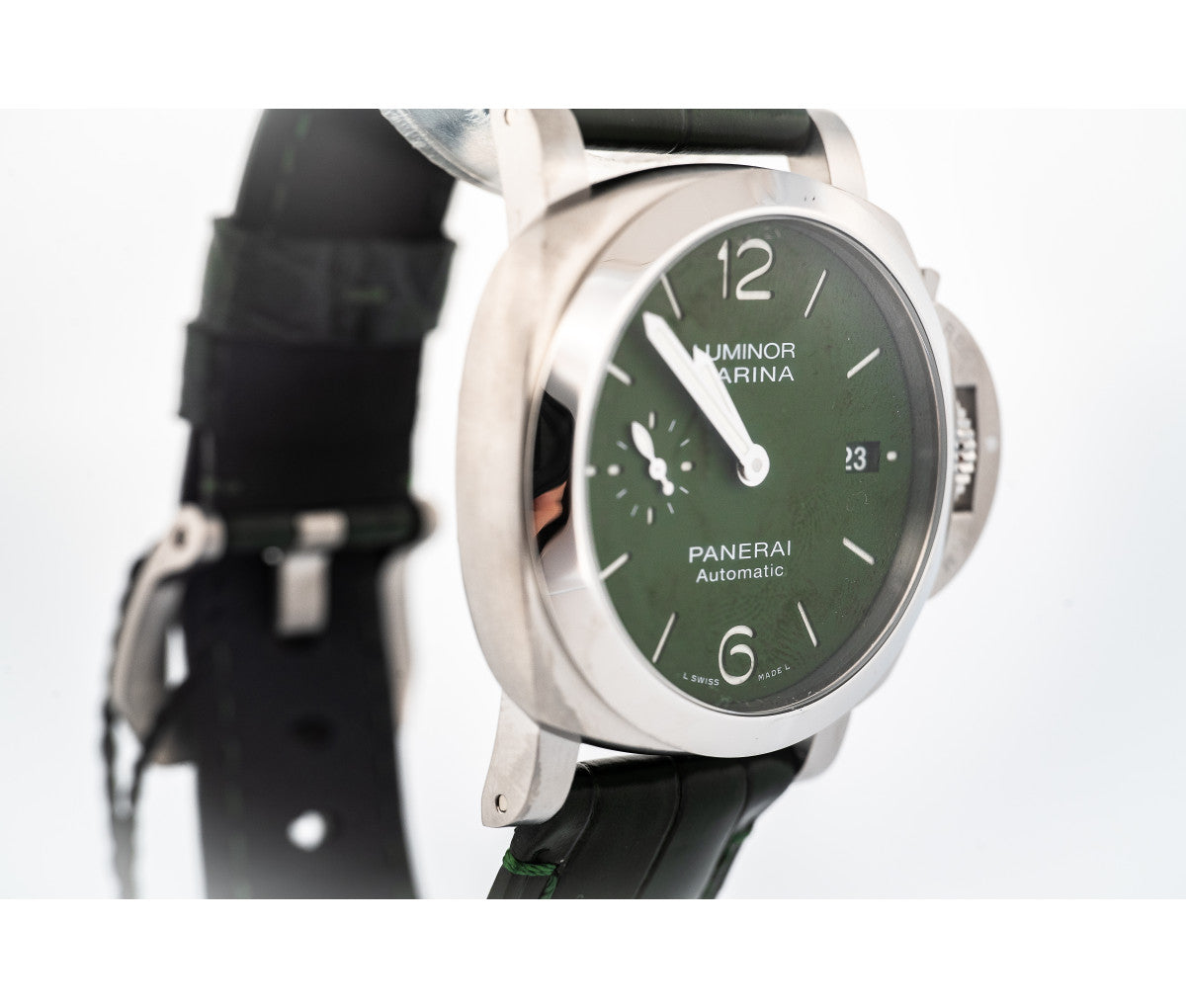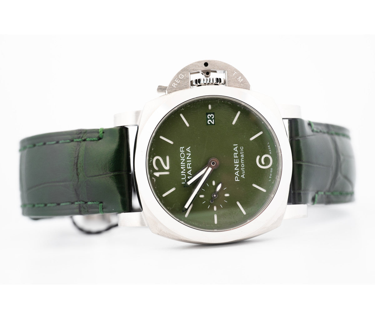 The Panerai Luminor Quaranta Verde Militare features a 40mm polished steel case and a striking matte green dial with luminous markers. Powered by the P.900 automatic movement, it offers a 3-day power reserve and 100m water resistance. Paired with a green leather strap, it combines rugged style with modern versatility.