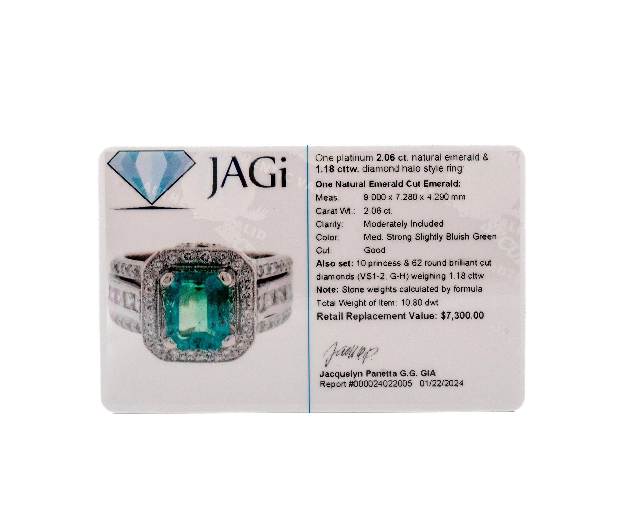 Elevate your style with this breathtaking Platinum Halo Ring featuring a stunning 2.06ct Emerald surrounded by 1.18 cttw Diamonds. Handcrafted with precision and care, this luxurious piece exudes elegance and sophistication. Perfect for special occasions or as a unique gift for someone special. Add a touch of glamour to your look with this timeless gemstone jewelry.