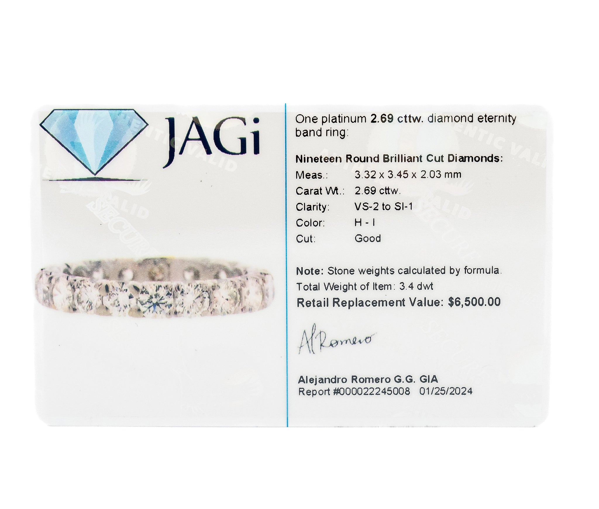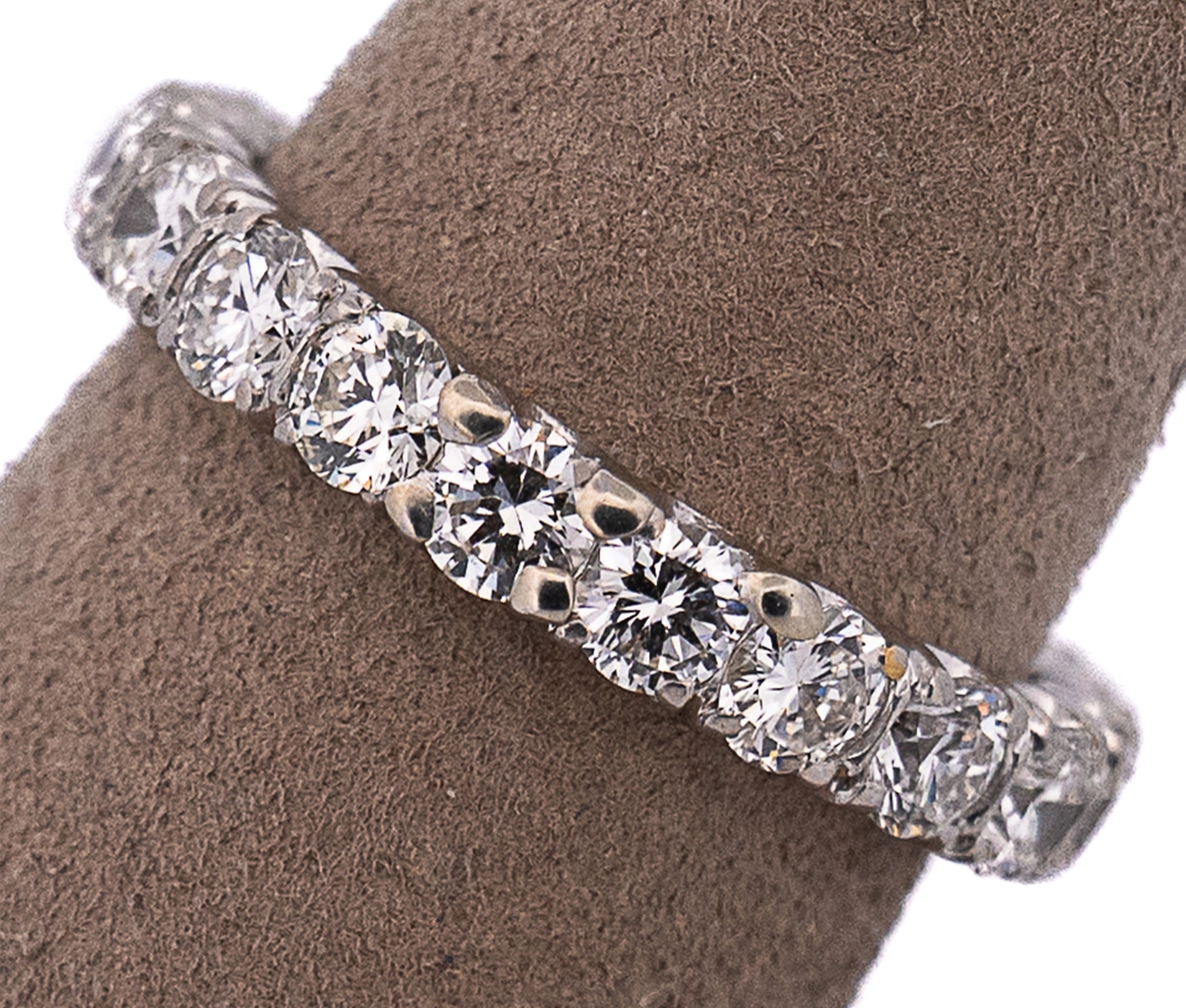 This Platinum 2.69ct Diamond Eternity Ring is a stunning symbol of everlasting love and commitment. This ring features a continuous band of sparkling diamonds, totaling 2.69 carats, which encircle the entire ring. The diamonds are set in a prong setting, allowing maximum light to pass through, enhancing their brilliance and fire. The platinum band not only adds a luxurious shine but also ensures durability and resistance to tarnishing. An eternity ring represents an unending bond, making it an ideal choice for anniversaries, weddings, or special milestones. The combination of high-quality diamonds and the sleek platinum setting creates a timeless piece that can be cherished for generations. Overall, this ring embodies elegance and sophistication, perfect for someone who appreciates fine jewelry with a meaningful touch.