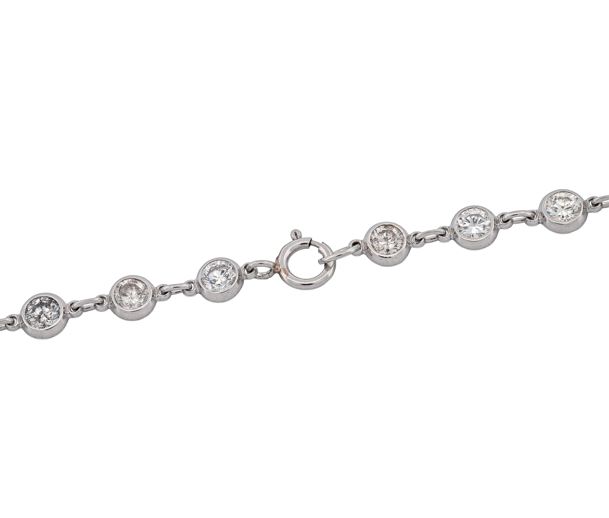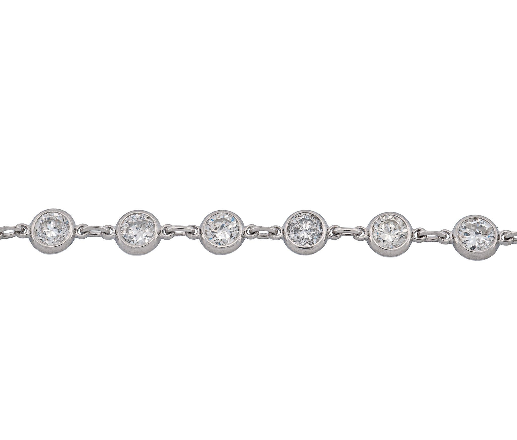 This exquisite 18.5-inch “Diamonds by the Yard” necklace is crafted in platinum and set with 62 round brilliant diamonds totaling 10.00 carats. Each diamond is bezel-set, offering a sleek, modern aesthetic while maximizing sparkle and security. Weighing 7.8 dwt, this luxurious piece is both lightweight and substantial, perfect for layering or wearing as a radiant statement. A timeless design that combines elegance and brilliance, ideal for elevating any fine jewelry collection.