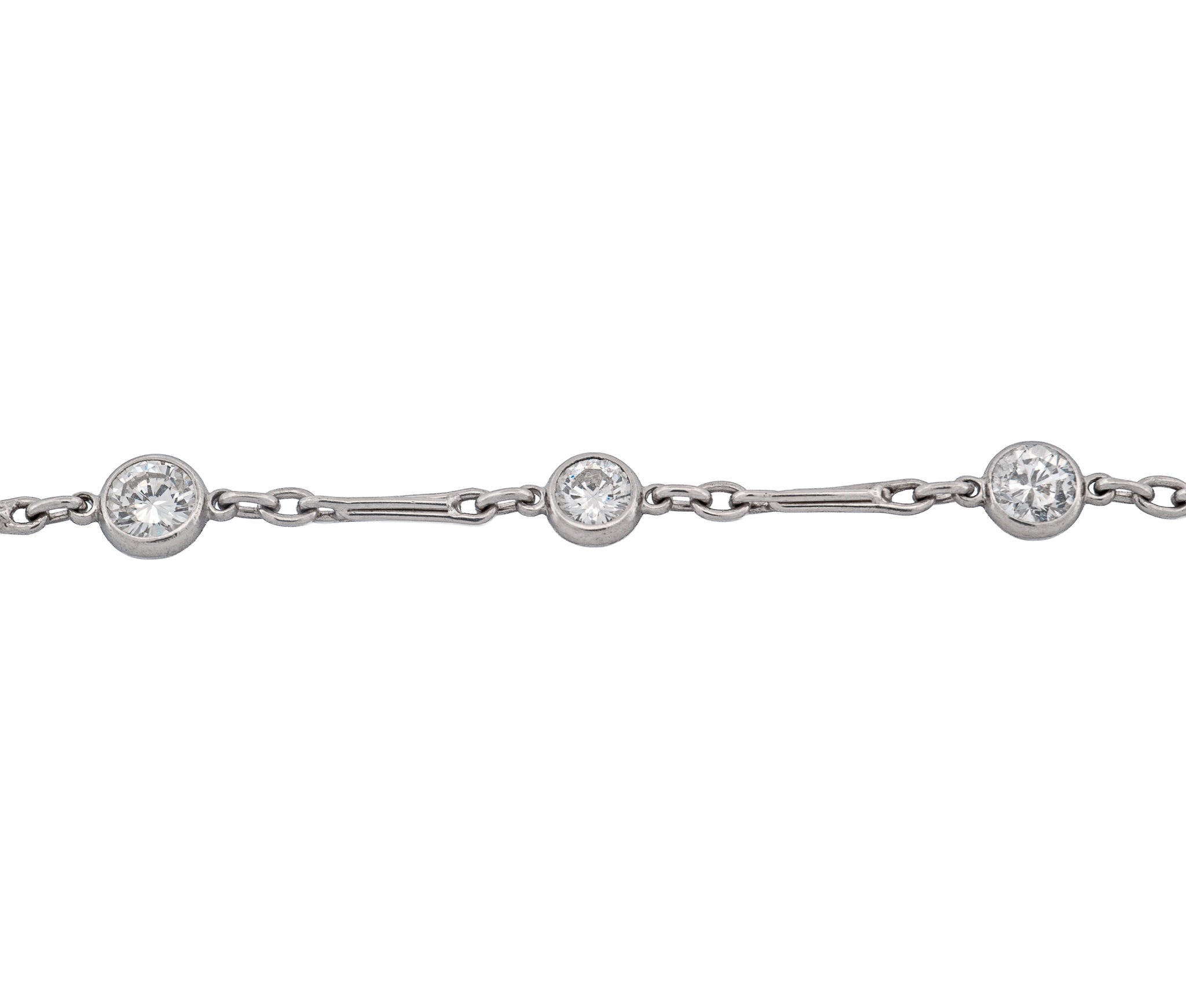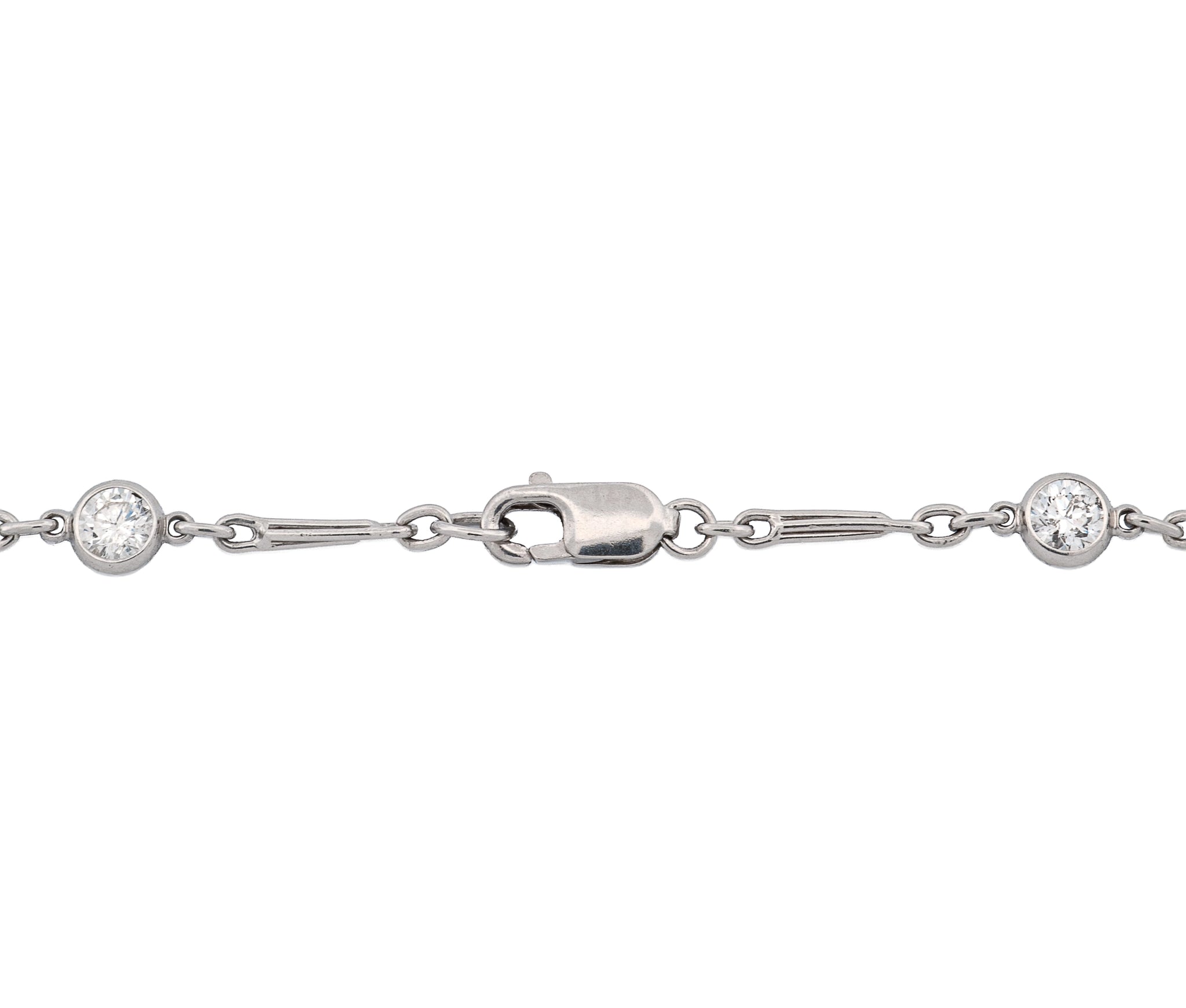 Crafted in luxurious platinum, this 36-inch “Diamonds by the Yard” necklace showcases 52 stones making 8.62 carats of dazzling round brilliant diamonds. Each stone is bezel-set to highlight its natural brilliance while offering a sleek, elegant look. Measuring an impressive 36 inches in length and weighing 12.5 dwt, this necklace is perfect for wearing long or doubled for a layered effect. A timeless statement piece that combines refined sparkle with the enduring beauty of platinum.