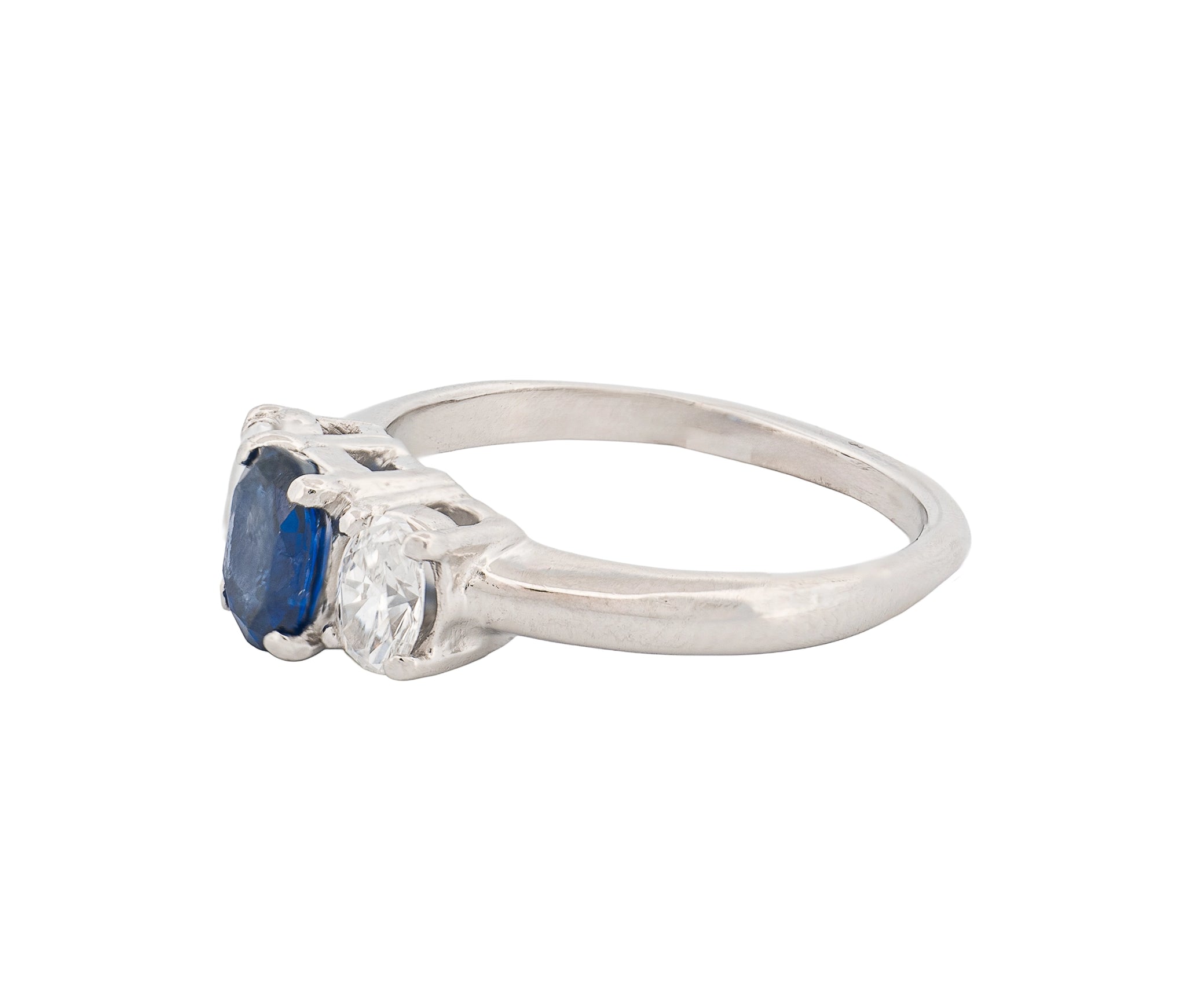 Flanking the center stone are two oval-shaped diamonds totaling 0.39 carats, graded VS1–VS2 clarity and F–G color, adding striking sparkle and balance to the design. The combination of platinum’s cool luster with the sapphire’s rich hue creates an elegant and enduring look. Weighing 4.50 grams, this piece blends understated luxury with exceptional craftsmanship.