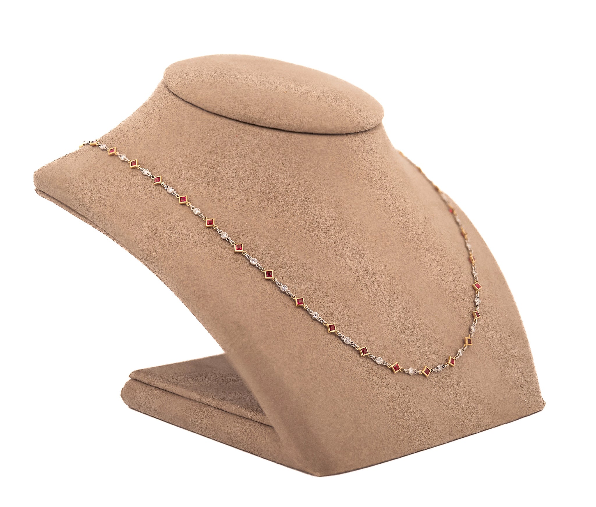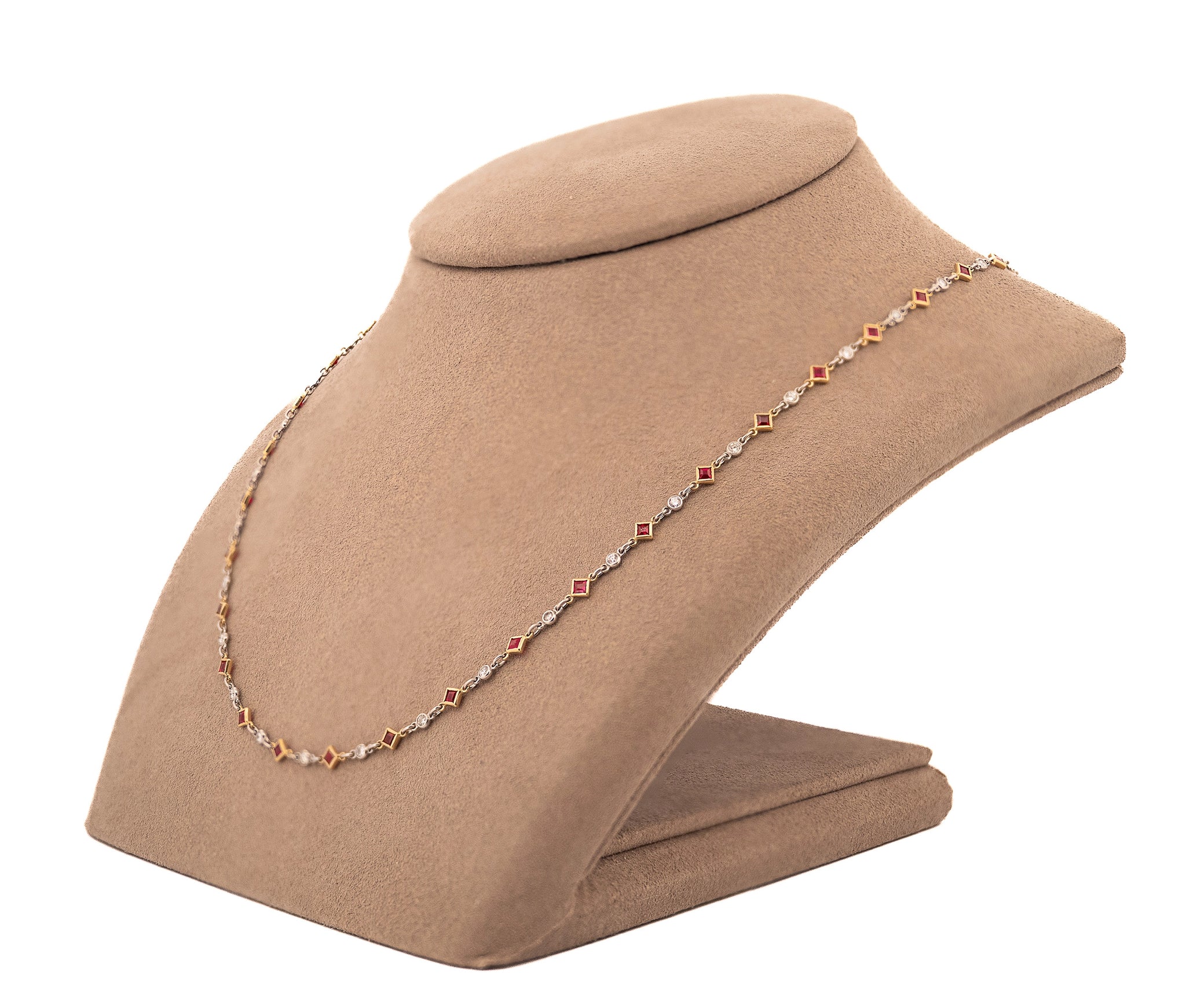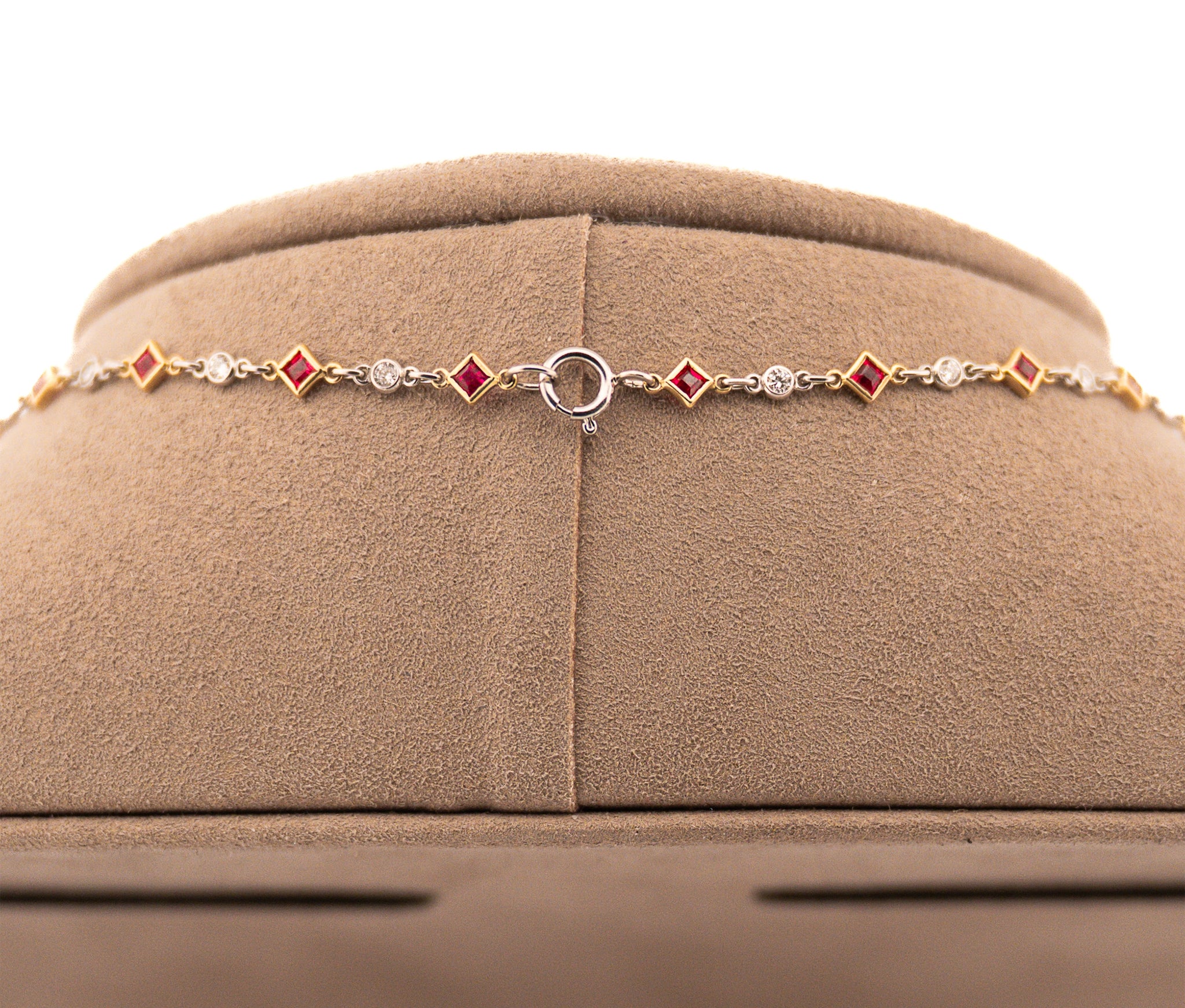Refined luxury meets timeless beauty in this Platinum Ruby and Diamond by the Yard Necklace. Expertly crafted in platinum, this delicate chain is accented with evenly spaced bezel-set rubies and sparkling diamonds, creating a graceful design that exudes elegance from every angle.
