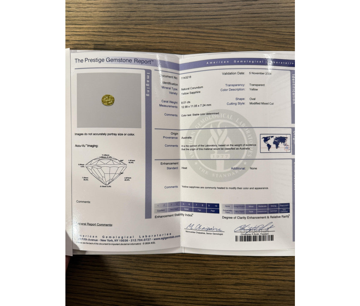 This luxurious ring features a magnificent 8.01ct oval-cut yellow sapphire, radiating vibrant color and brilliance. Flanked by two .55ct triangular-cut diamonds, it exudes elegance and symmetry. Crafted in platinum, this size 9 masterpiece offers timeless sophistication and unparalleled quality, perfect for celebrating life’s most special moments.