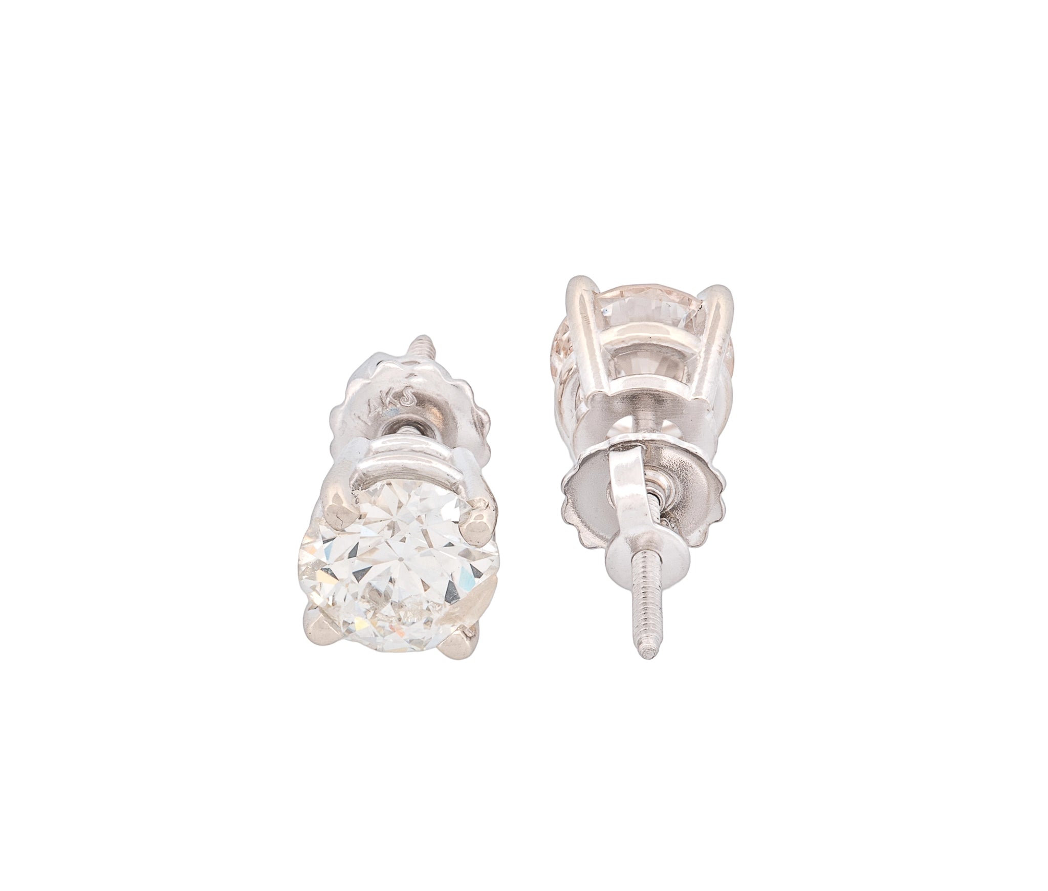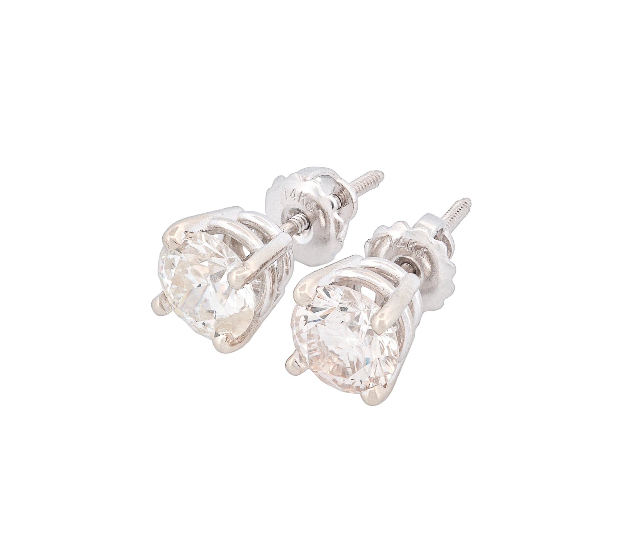 These striking GIA-certified diamond stud earrings feature a total weight of 2.17 carats of round brilliant-cut diamonds, offering a bold and timeless look. Graded K–M color and I1–I2 clarity, the diamonds display warm tones and lively sparkle, beautifully enhanced by their expert cut and symmetry. Set in classic 14K white gold four-prong mountings, these studs balance elegance and everyday wearability—perfect for those who appreciate statement-making diamond jewelry. A radiant pair that adds sophistication and brilliance to any collection.