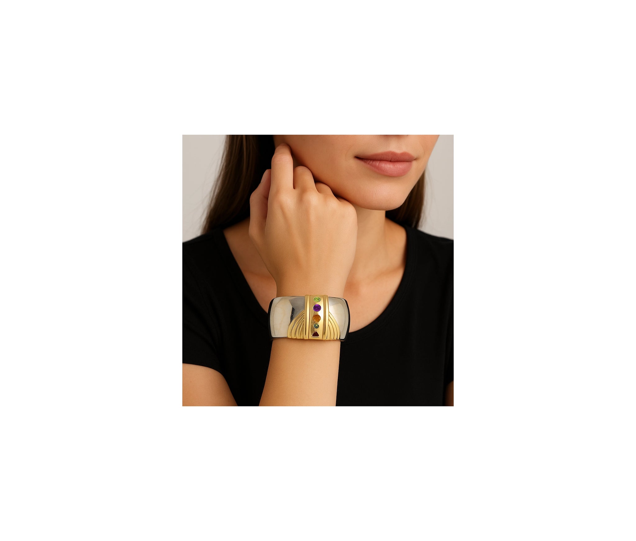 925 sterling silver and 18K yellow gold authentic La Nouvelle Bague bezel set multi gemstone wide bangle bracelet with 1 triangle cut rhodolite garnet weighing 1.01 ct., 1 round cut blue topaz weighing 0.35 ct., 1 oval citrine quartz weighing 0.54 ct., 1 round peridot weighing 0.35 ct. & 1 oval amethyst weighing 0.26 ct.