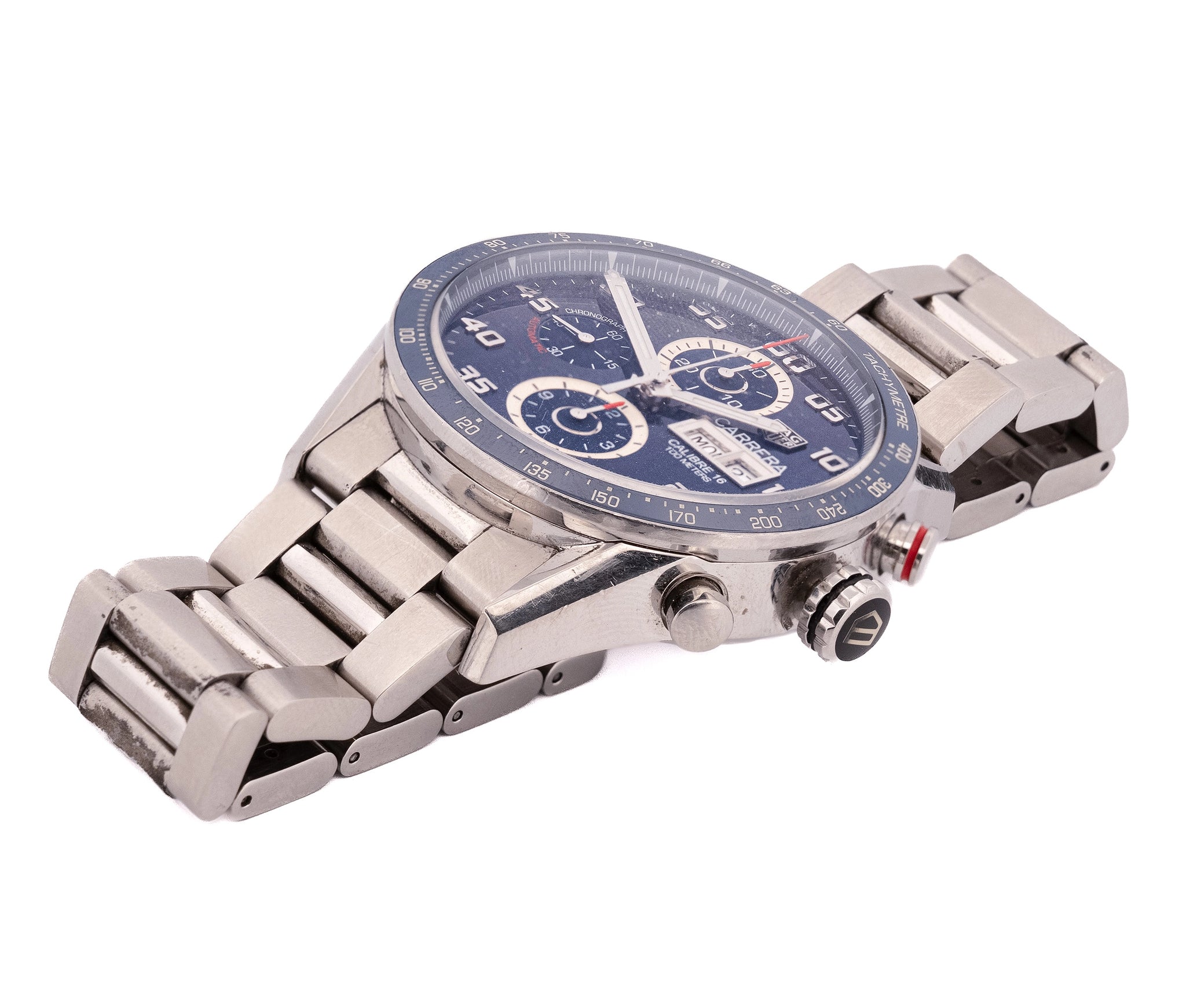 The Tag Heuer Carrera Calibre 16 features a 43mm stainless steel case, bold blue dial, automatic movement, chronograph functions, and 100m water resistance, combining sporty elegance with reliable performance inspired by Tag Heuer’s motorsport heritage.