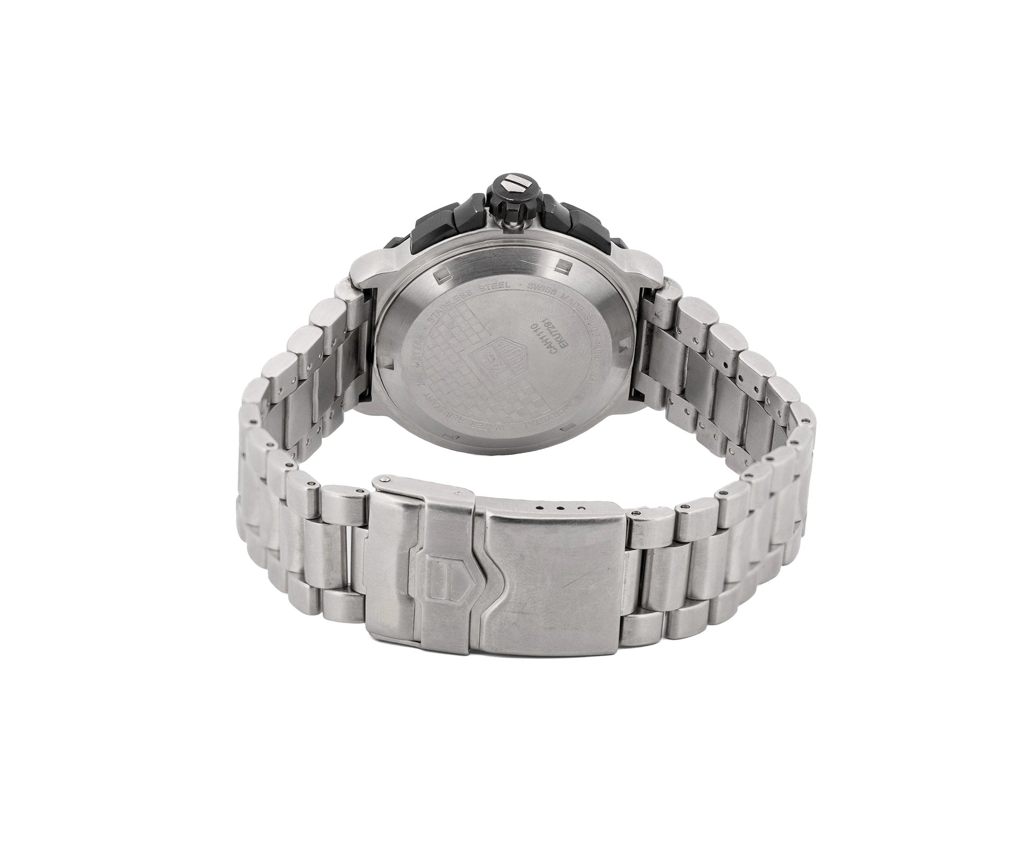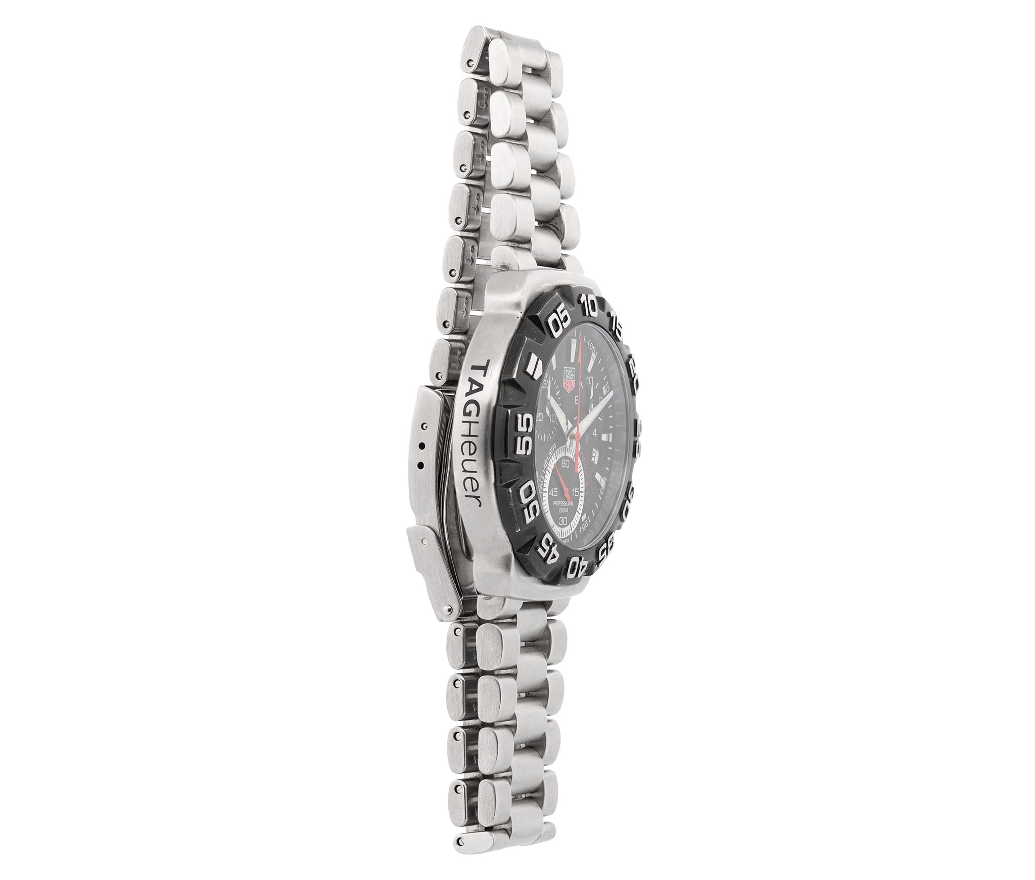 The Tag Heuer Formula 1 is a thrilling blend of precision, power, and sporty sophistication. Designed for those who thrive on speed and performance, this timepiece features a 40mm stainless steel case, housing a quartz movement for reliable and accurate timekeeping. The striking black dial with bold white and red accents, complemented by luminous hands and markers, gives it a high-energy, racing-inspired aesthetic. The tachymeter bezel adds a functional touch, perfect for measuring speed and distance. With its sleek metal bracelet, the watch is both comfortable and ready for action.