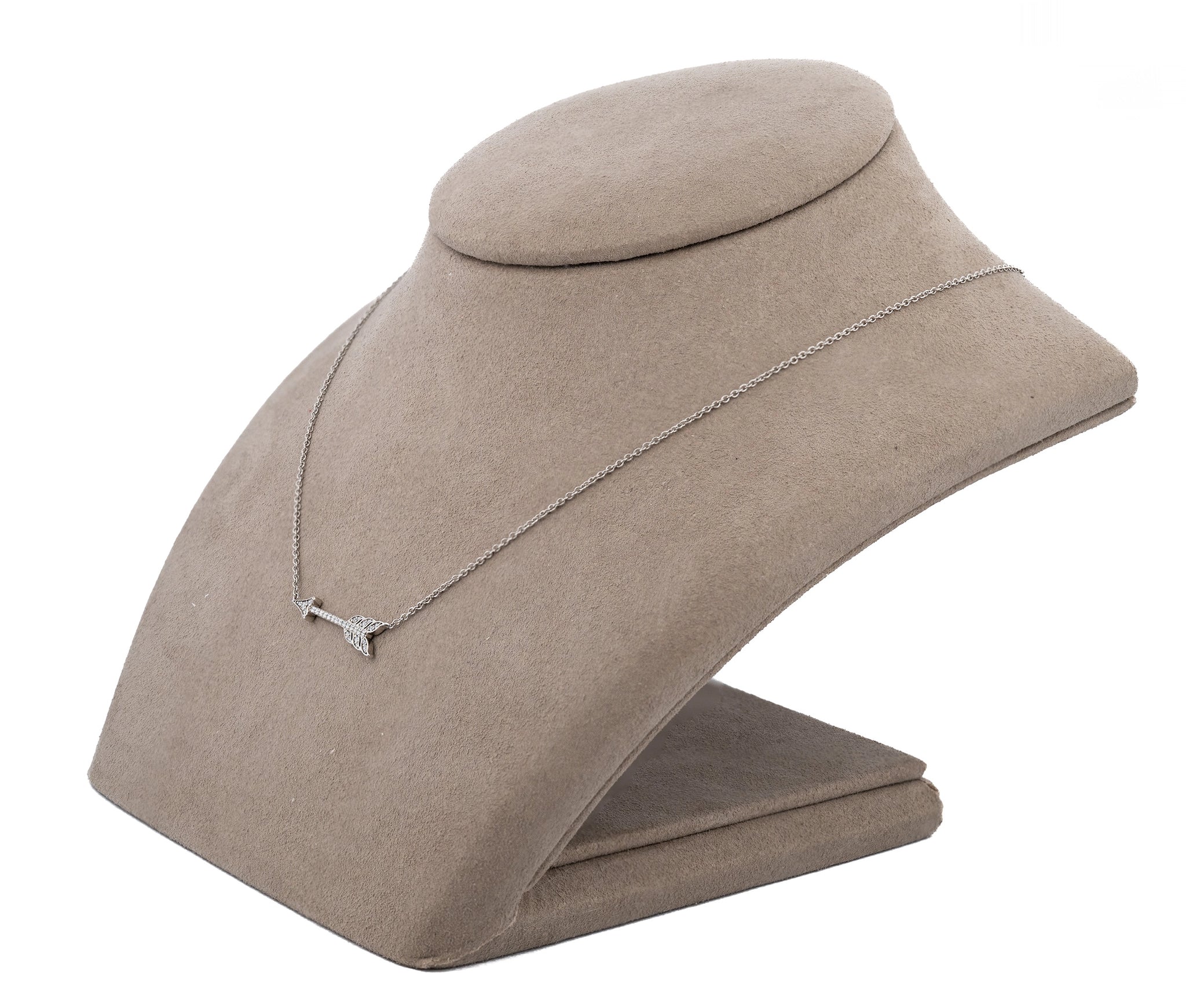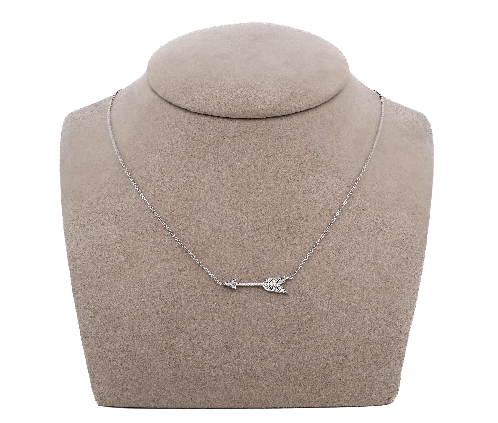 The Tiffany & Co. Platinum Diamond Arrow Necklace is a refined piece from the brand's Hearts Collection. Crafted in platinum, it features an arrow-shaped pendant pavé-set with 30 round brilliant-cut diamonds totaling approximately 0.20 carats. The necklace measures about 16 inches in length, secured with a spring ring clasp. This necklace embodies Tiffany's timeless elegance and exceptional craftsmanship