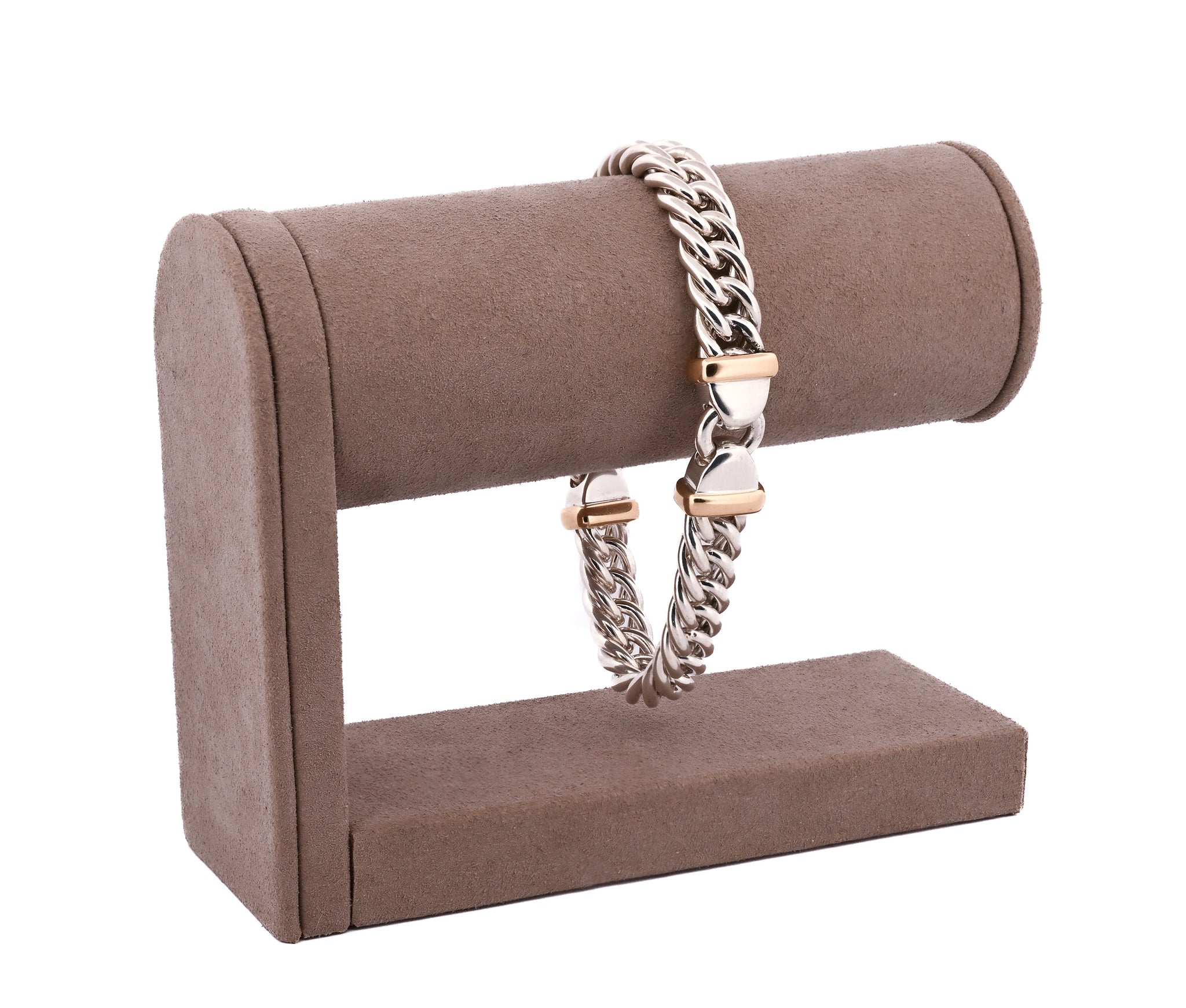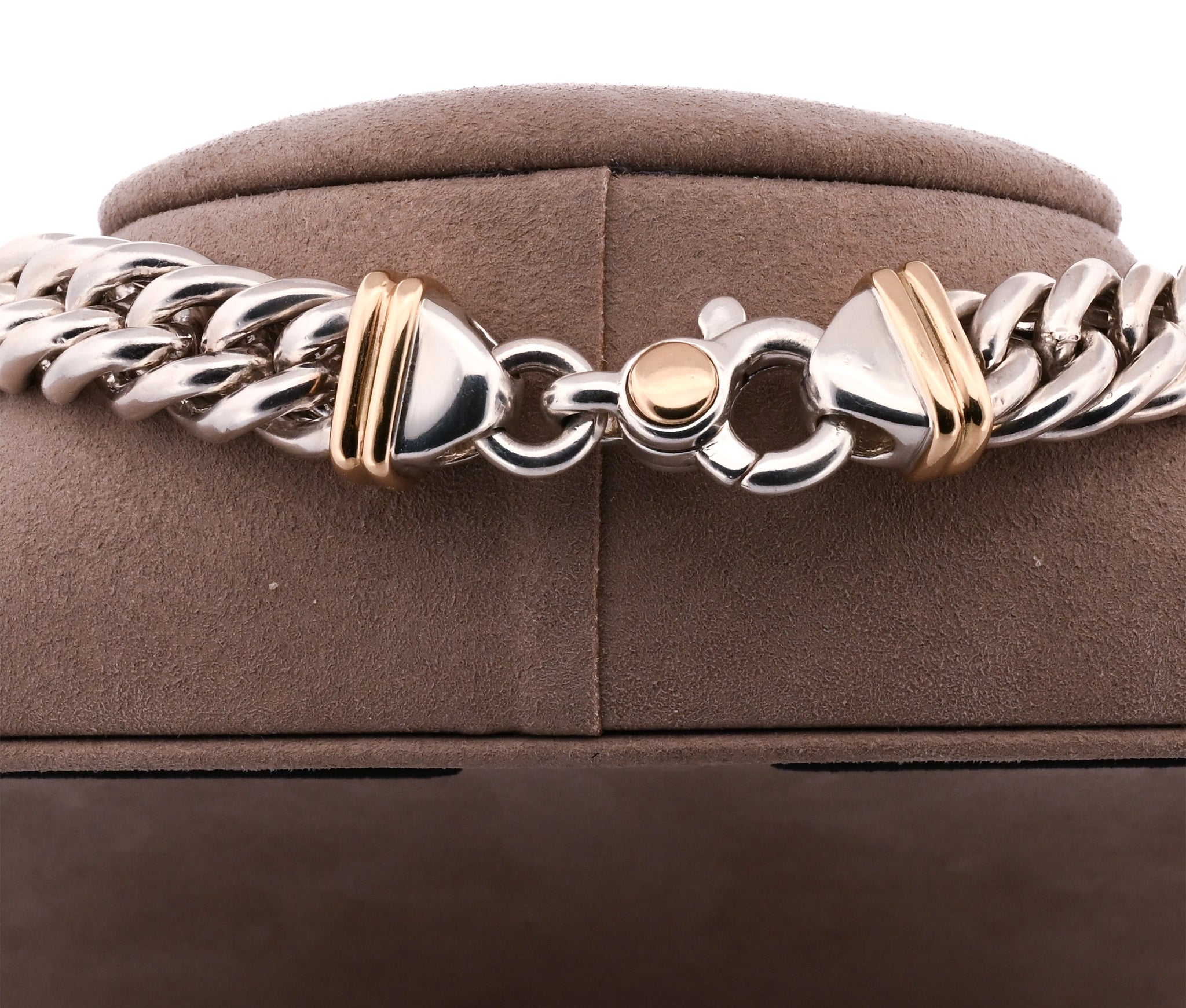 This exquisite Tiffany & Co. Necklace and Bracelet Set is a perfect blend of elegance and bold style. The 15-inch necklace features a striking combination of sleek sterling silver and warm 18k gold Cuban accents, creating a refined, eye-catching look. Paired with a size 7-inch bracelet, this set offers a coordinated, luxurious feel. Crafted with Tiffany's signature craftsmanship, this set is an ideal choice for those seeking a statement piece that effortlessly combines classic design with modern sophistication. This set is in good condition with light signs of wear.