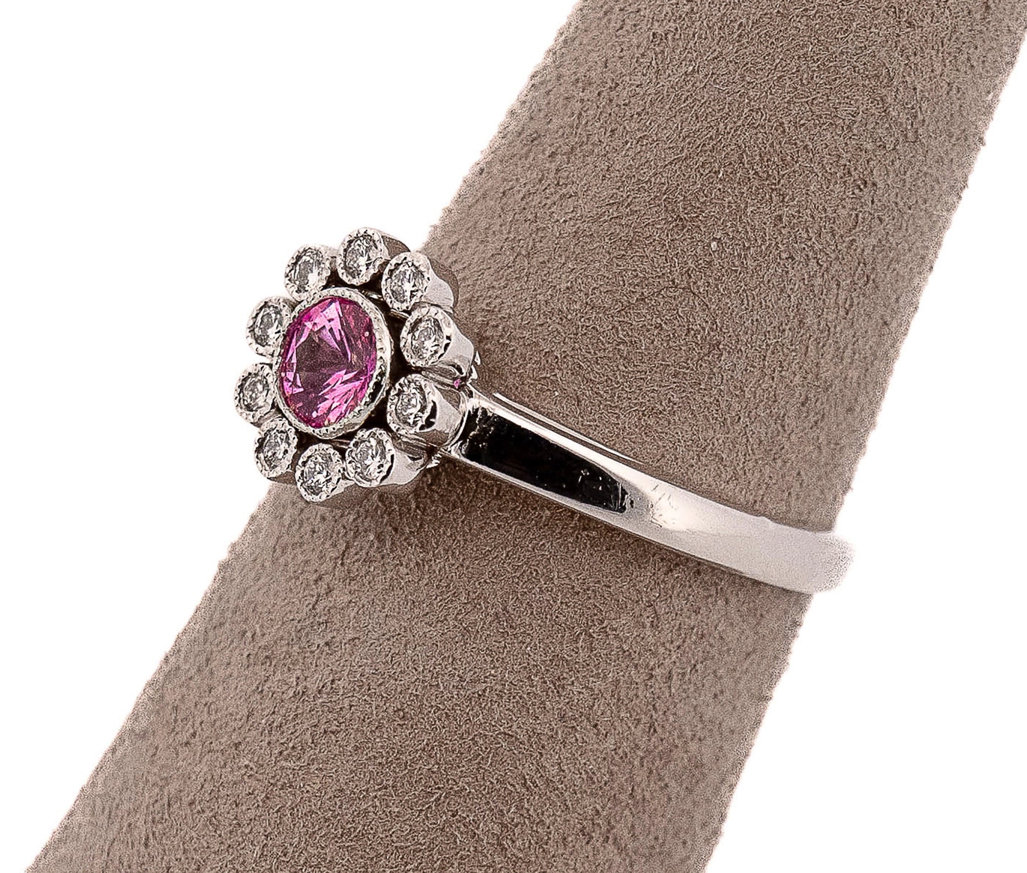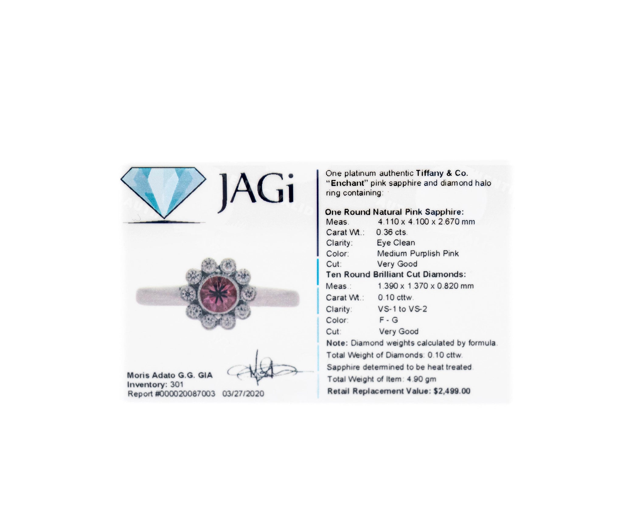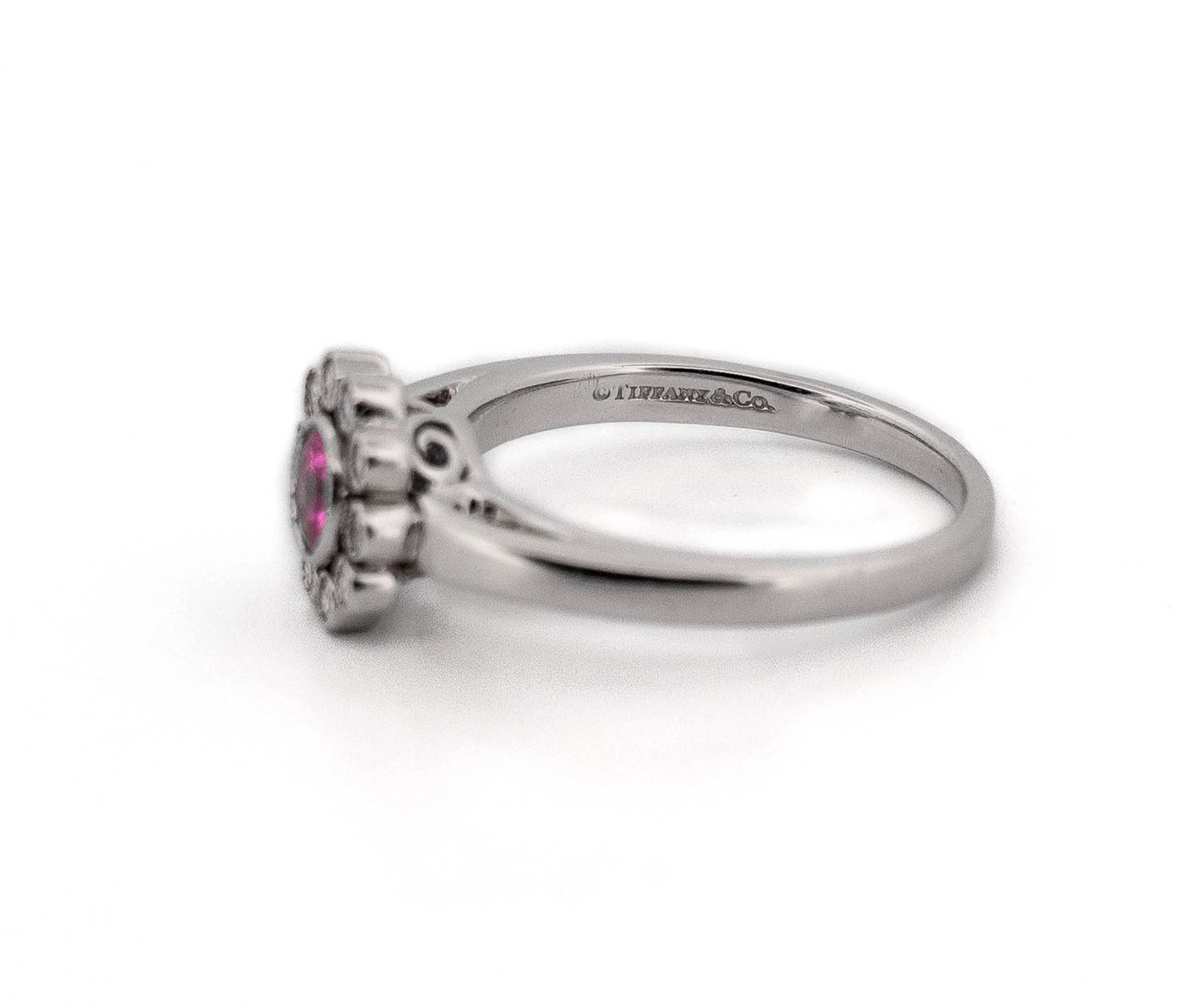 Tiffany & Co Platinum Enchant Pink Sapphire & .10ct Diamond Halo Ring