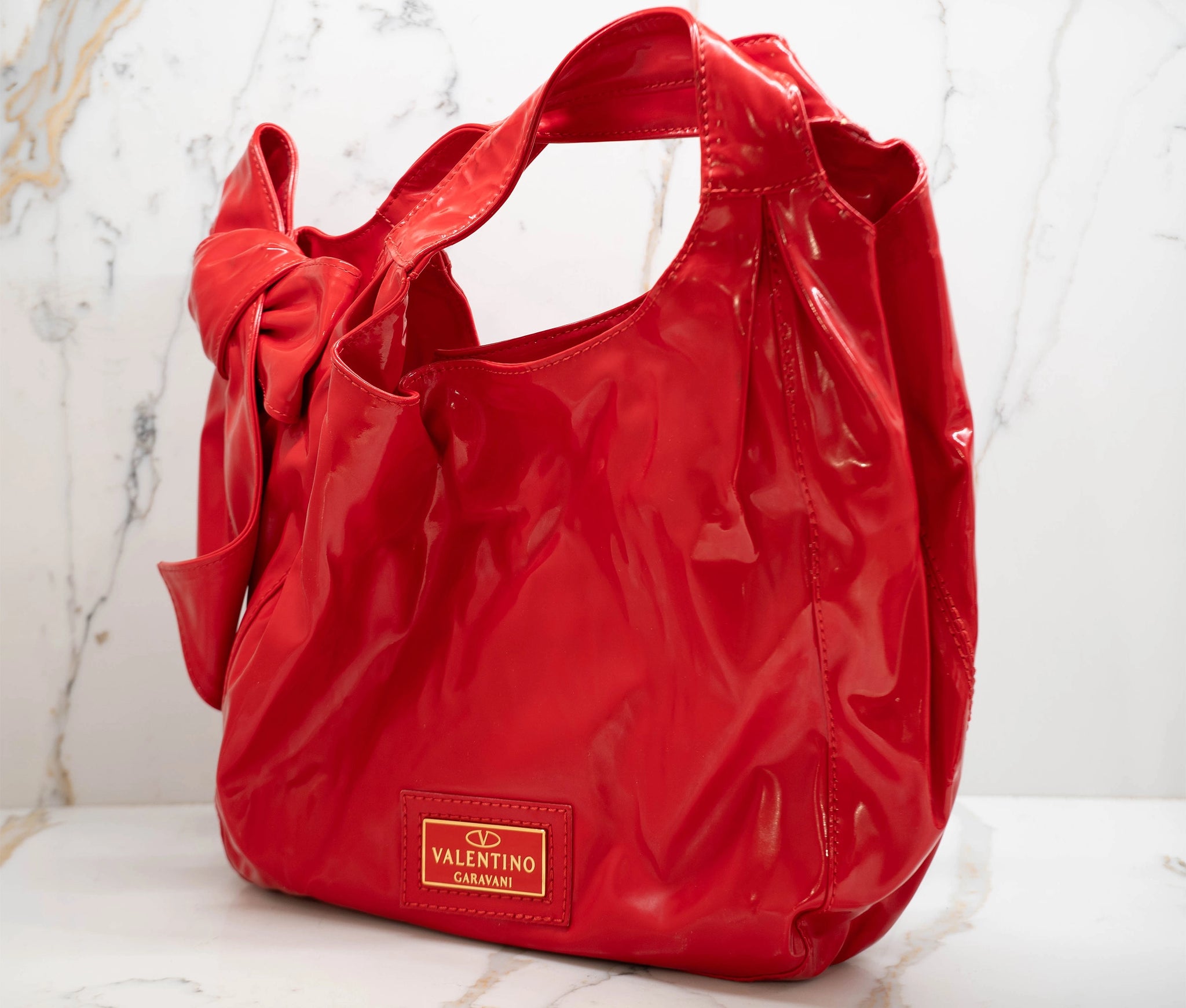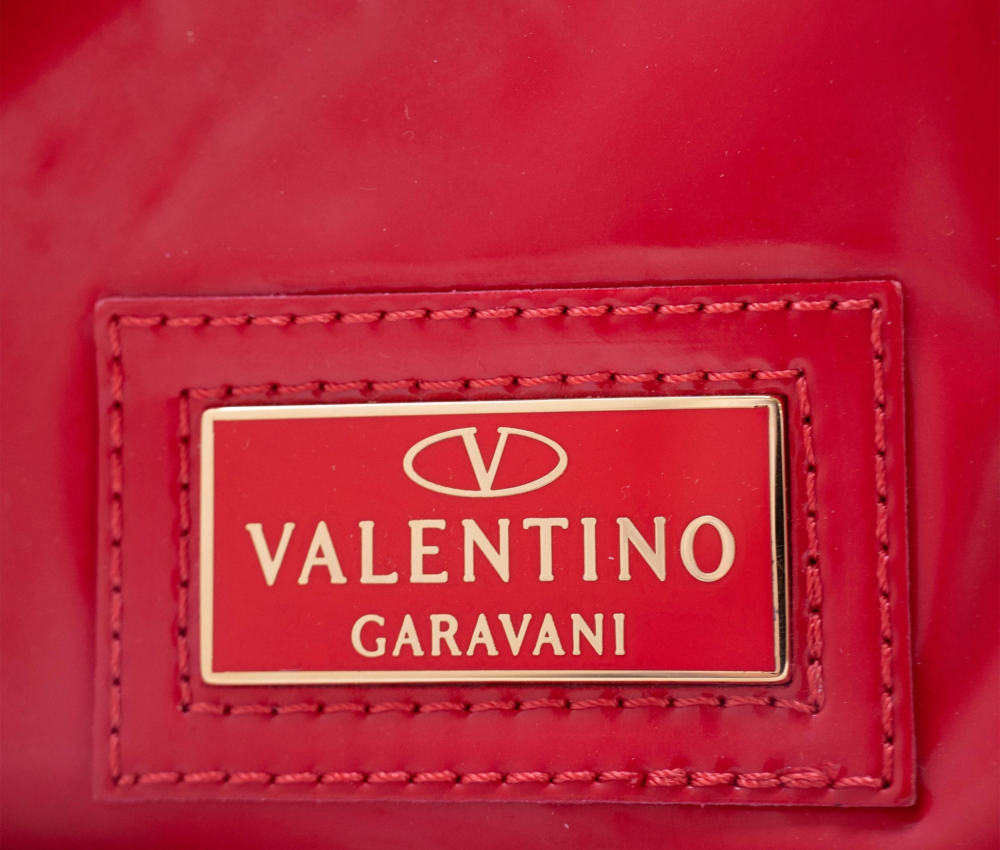 Exterior patent leather shows scuffing and fading in various locations throughout. Exterior shows creasing. Interior shows light scuffing and minimal wear.