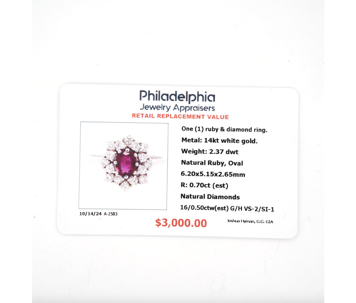 This elegant Ruby and Diamond Halo Ring, set in 14K white gold, features a stunning ruby at its center, surrounded by a radiant halo of diamonds totaling 0.50cts. The deep red ruby, symbolizing passion and love, is beautifully framed by the sparkling diamonds, which add a brilliant touch of sophistication. The crisp, lustrous white gold band perfectly complements the vibrant gemstones, creating a timeless piece that exudes both warmth and elegance. A perfect choice for those seeking a classic, yet eye-catching, statement ring.
