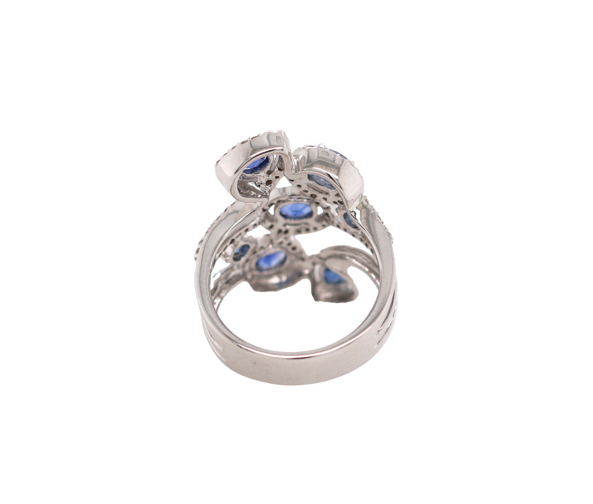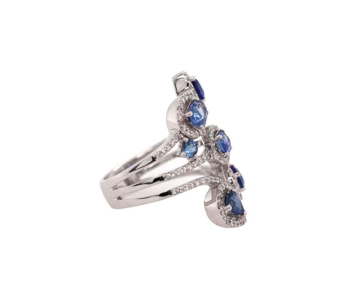 Complementing the diamonds, the ring is adorned with vibrant sapphires, known for their rich blue hues. The combination of the clear diamond and the deep blue sapphires creates a striking visual contrast, adding depth and sophistication to the design.