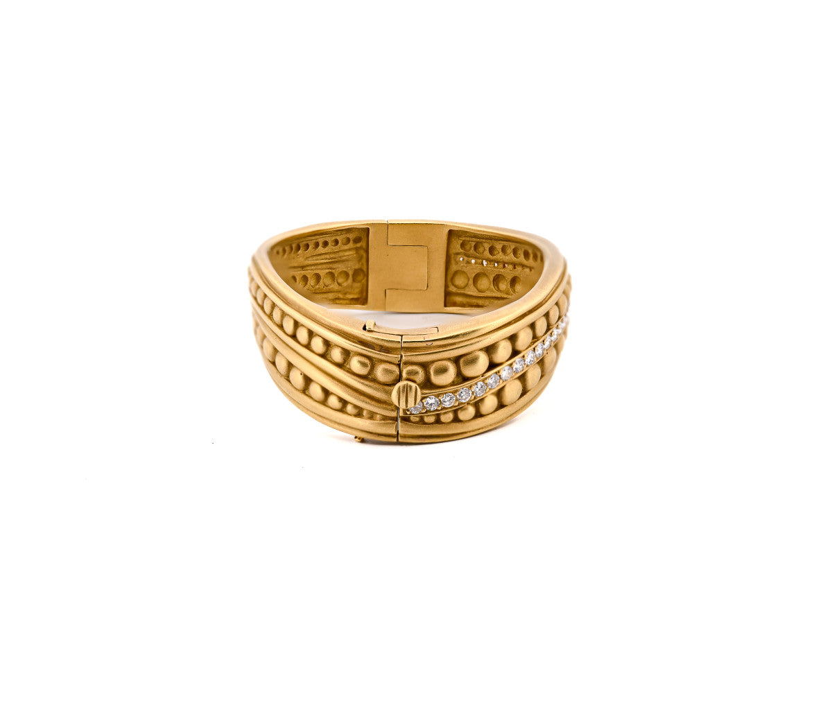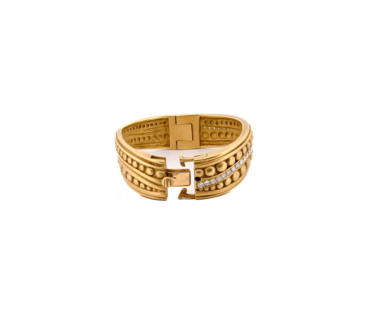 The Caviar collection by Kieselstein Cord is known for its bead like detailing and pave set diamond accents. Stamped from 1982 and in excellent condition, with minimal wear and secure diamonds.
