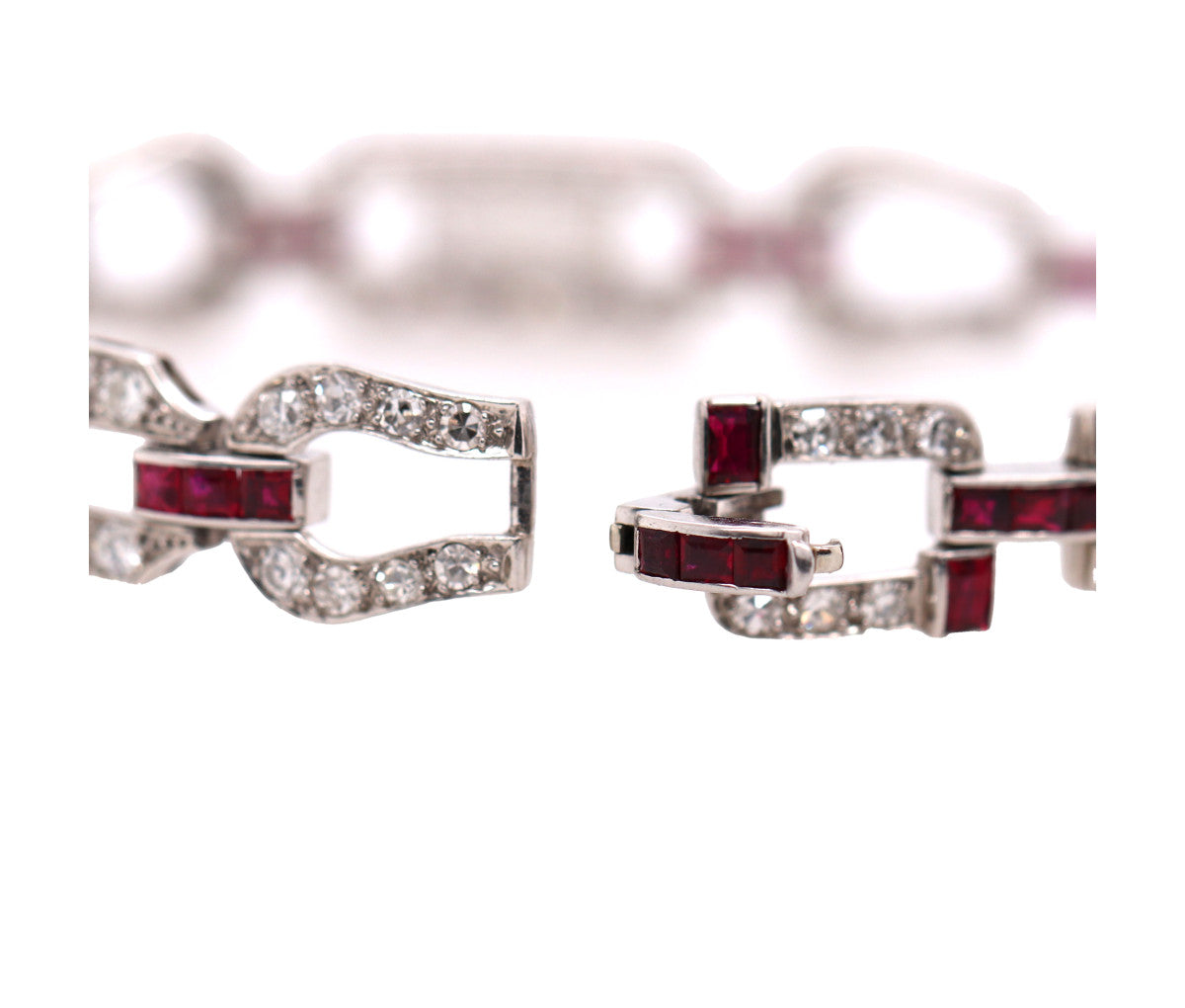 Expertly crafted in enduring platinum, this bracelet features a series of radiant, deep red rubies, each carefully selected for its vibrant color and exquisite clarity. The rich, fiery hue of the rubies is beautifully complemented by the brilliance of 3.50 carats of sparkling diamonds, which are meticulously set along the band to enhance the overall allure.